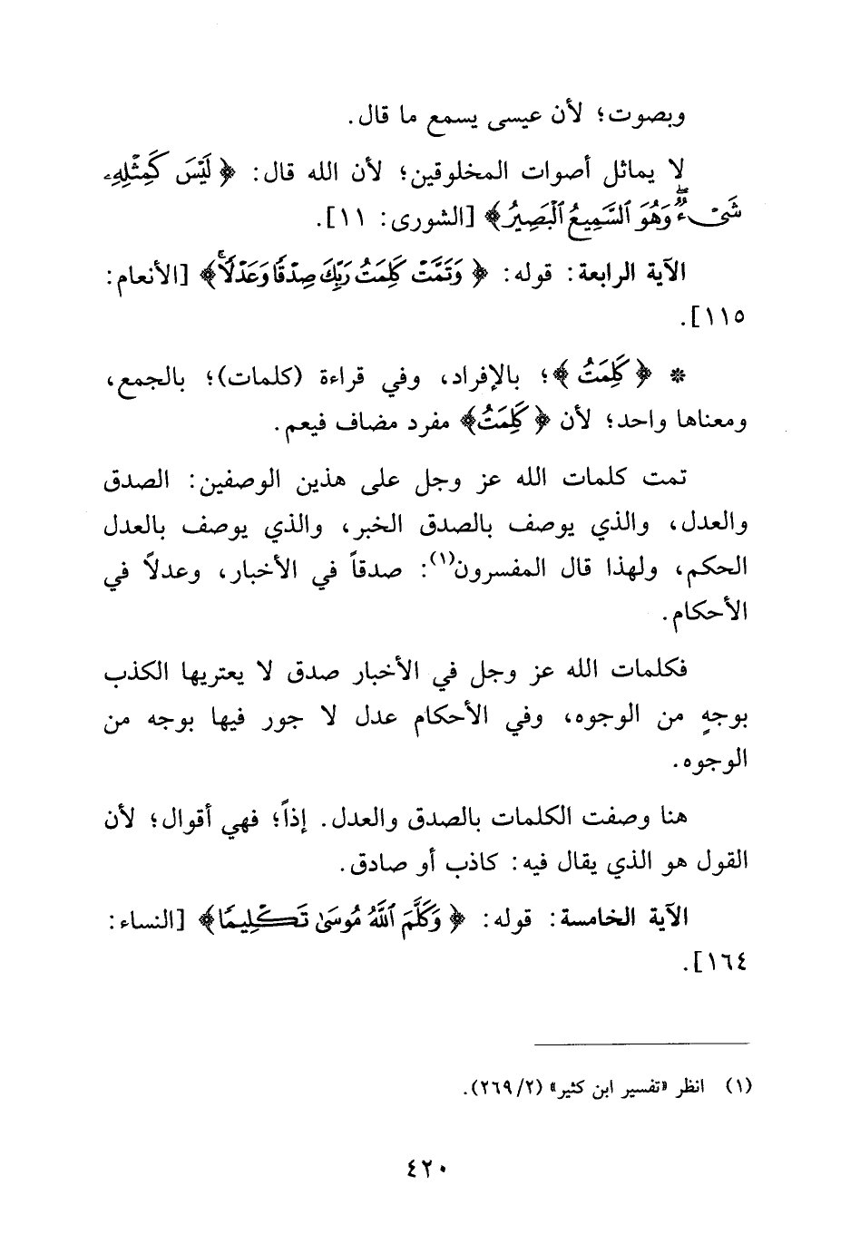 الآية الرابعة: قوله: {وَتَمَّتْ كَلِمَتُ رَبِّكَ صِدْقاً وَعَدْلاً} [الأنعام: 115].