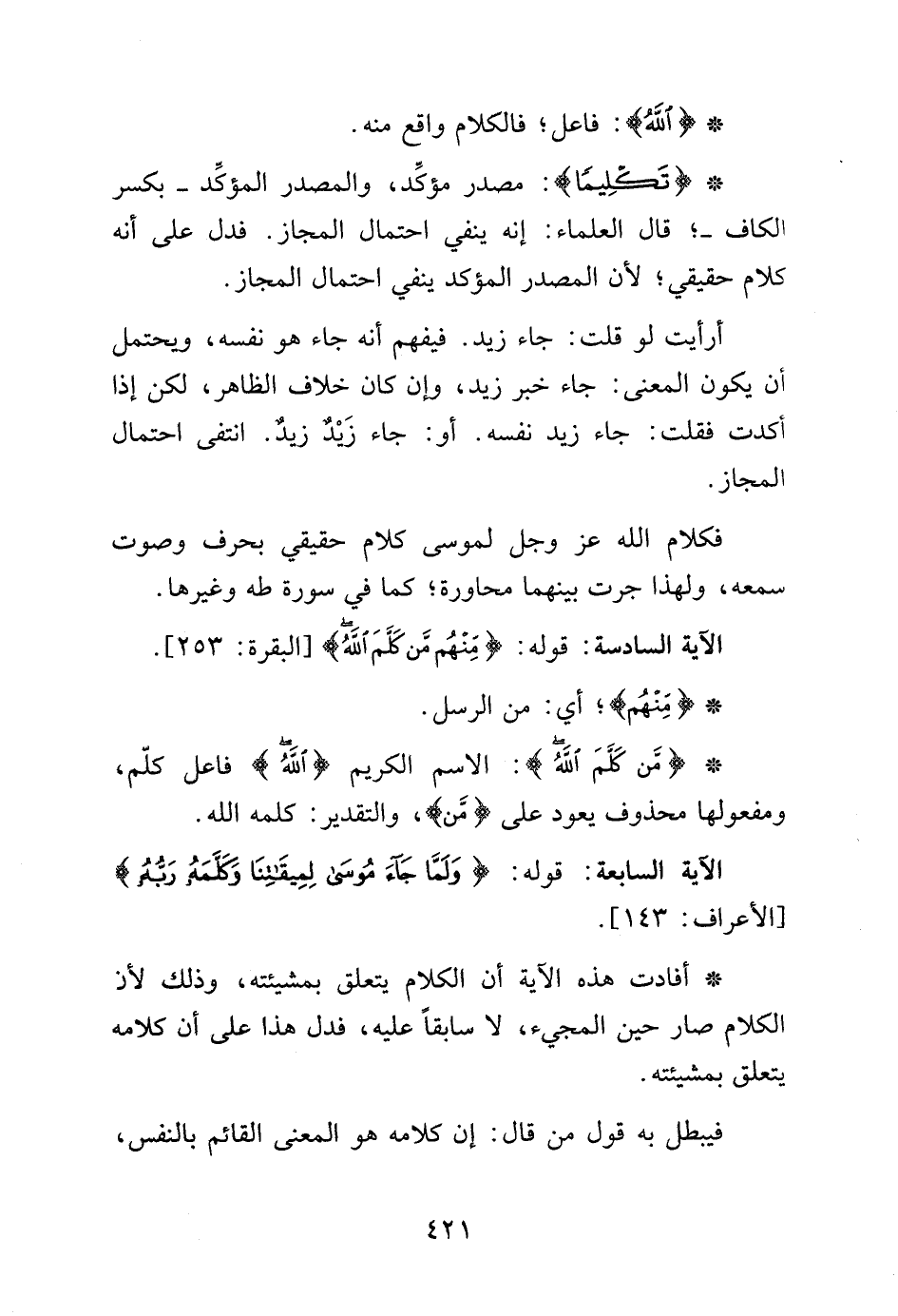 {تَكْلِيماً}: مصدر مؤكد, والمصدر المؤكد –بكسر الكاف-؛ قال العلماء: إنه ينفي احتمال المجاز. فدل على أنه كلام حقيقي؛ لأن المصدر المؤكد ينفي احتمال المجاز.