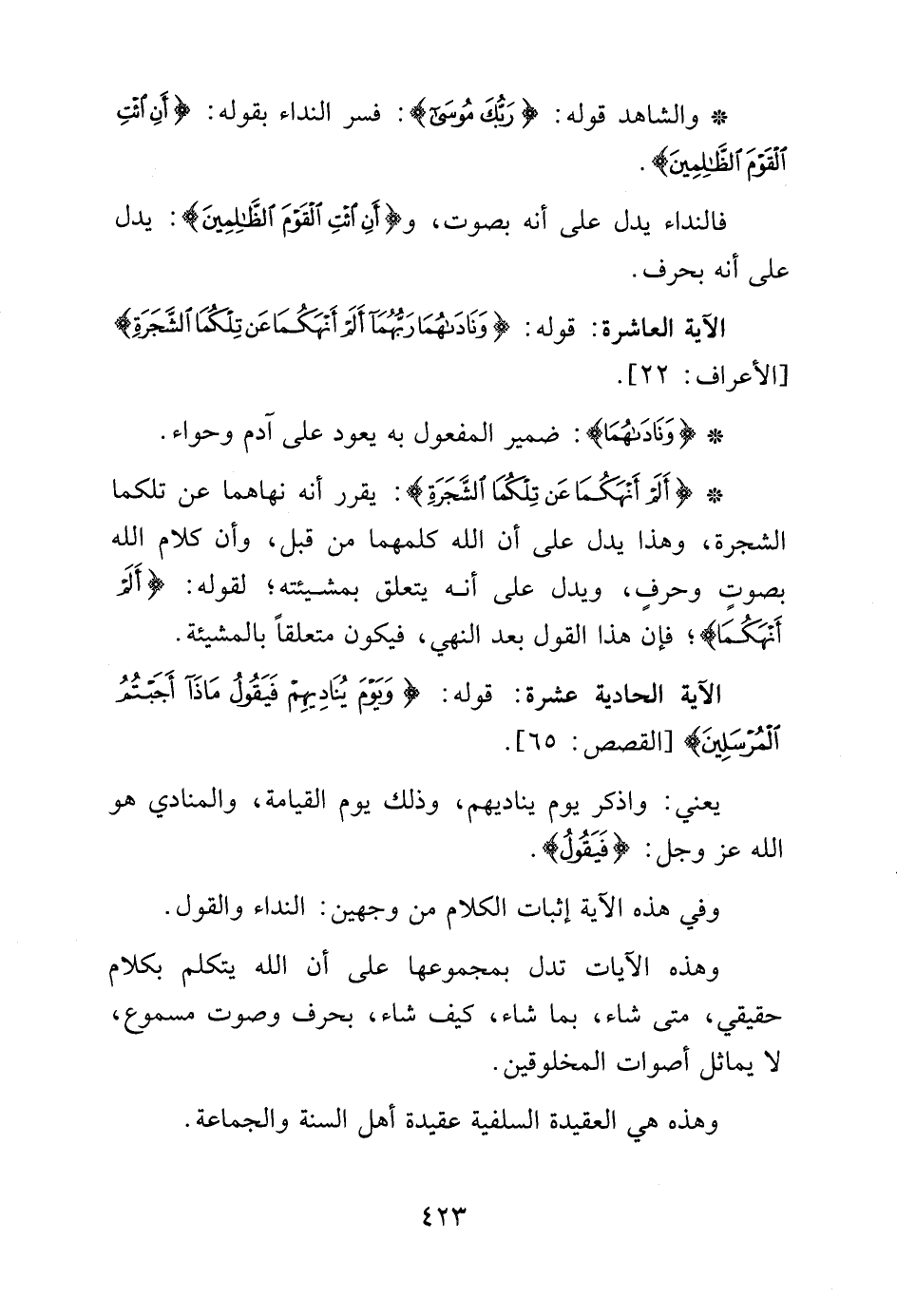 وهذه الآيات تدل بمجموعها على أن الله يتكلم بكلام حقيقي، متى شاء, بما شاء, بحرف وصوت مسموع، لا يماثل أصوات المخلوقين.