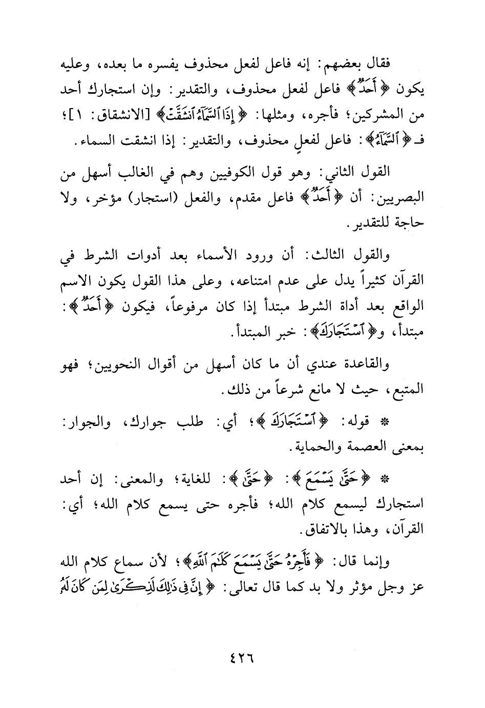 فقال بعضهم: إنه فاعل لفعل محذوف يفسره ما بعده, وعليه يكون {أَحَدٌ} فاعل لفعل محذوف, والتقدير: وإن استجارك أحد من المشركين؛ فأجره، ومثلها: {إِذَا السَّمَاءُ انْشَقَّتْ} [الانشقاق: 1] فـ {السَّمَاءُ} فاعل لفعل محذوف, والتقدير: إذا انشقت السماء.