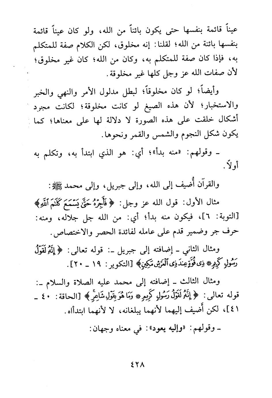 وأيضاً؛ لو كان مخلوقاً؛ لبطل مدلول الأمر والنهي والخبر والاستخبار؛ لأن هذه الصيغ لو كانت مخلوقة. لكانت مجرد أشكال خلقت على هذه الصورة لا دلالة لها على معناها؛ كما يكون شكل النجوم والشمس والقمر ونحوها.