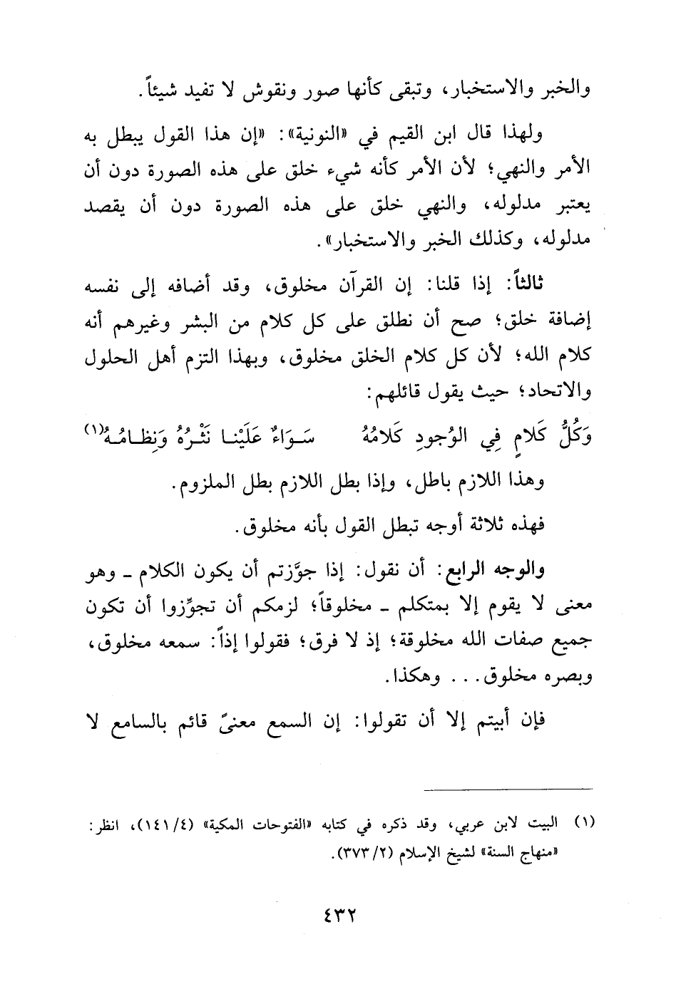ولهذا قال ابن القيم في "النونية": "إن هذا القول يبطل به الأمر والنهي؛ لأن الأمر كأنه شيء خلق على هذه الصورة دون أن يعتبر مدلوله، والنهي خلق على هذه الصورة دون أن يعتبر مدلوله, والنهي خلق على هذه الصورة دون أن يقصد مدلوله، وكذلك الخبر والاستخبار".