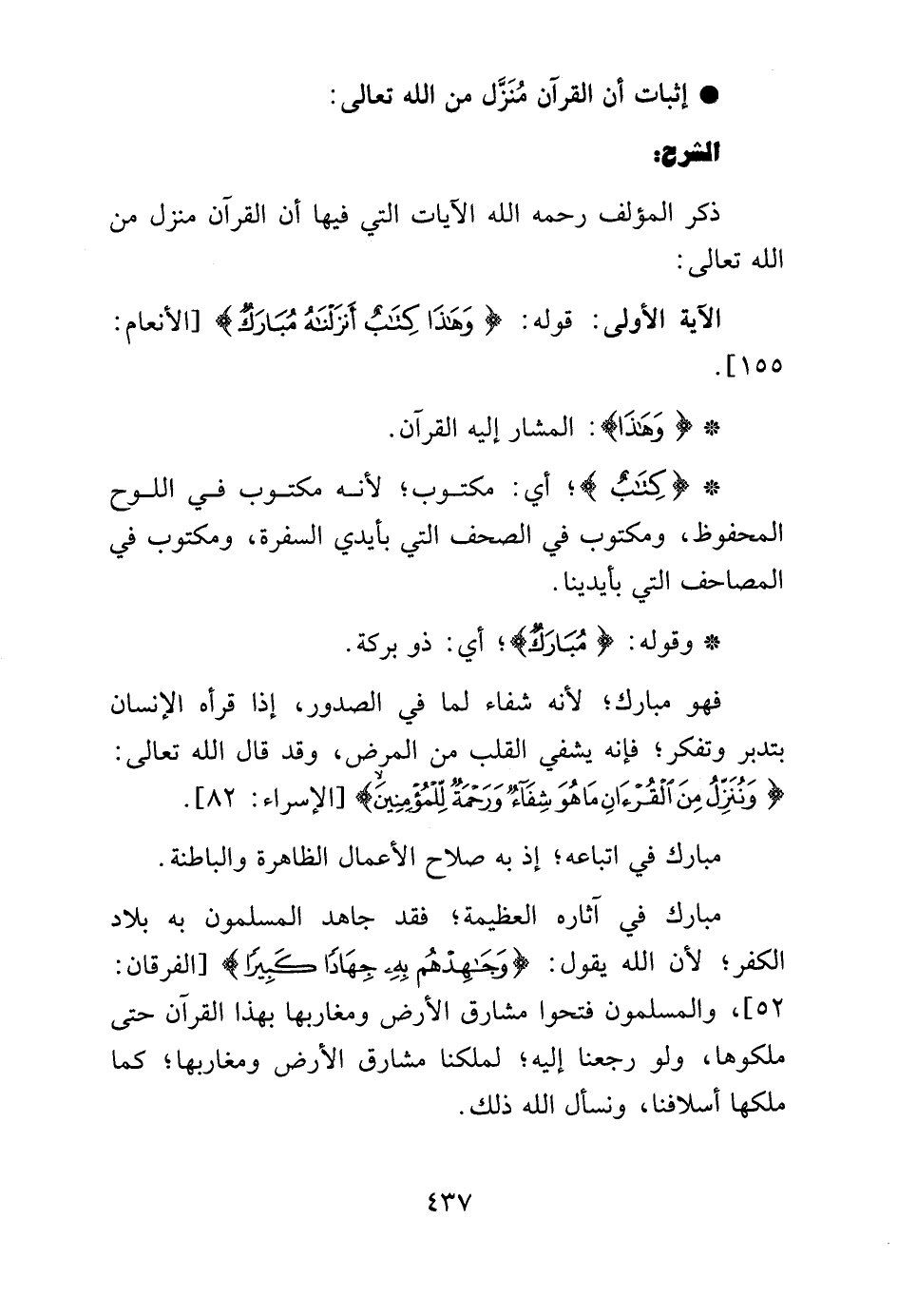 الآية الأولى: قوله: {وَهَذَا كِتَابٌ أَنْزَلْنَاهُ مُبَارَكٌ} [الأنعام:155].