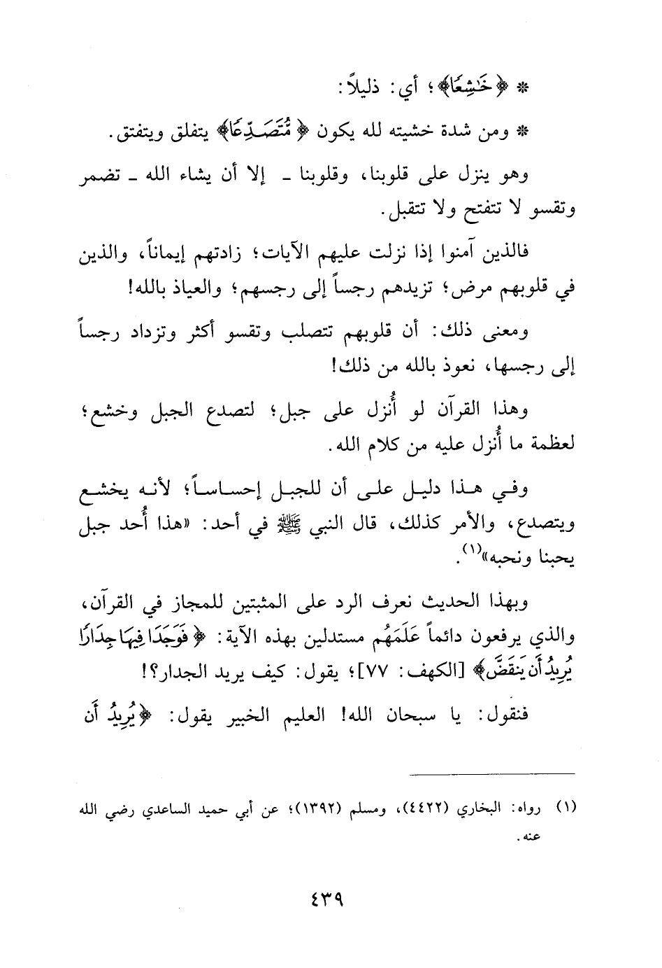 وبهذا الحديث نعرف الرد على المثبتين للمجاز في القرآن, والذي يرفعون دائماً علمهم مستدلين بهذه الآية: {فَوَجَدَا فِيهَا جِدَاراً يُرِيدُ أَنْ يَنْقَضَّ} [الكهف: 77]؛ يقول: كيف يريد الجدار؟!