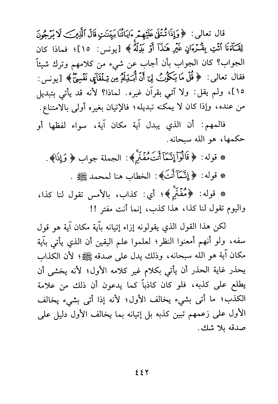 قال تعالى: {وَإِذَا تُتْلَى عَلَيْهِمْ آيَاتُنَا بَيِّنَاتٍ قَالَ الَّذِينَ لا يَرْجُونَ لِقَاءَنَا ائْتِ بِقُرْآنٍ غَيْرِ هَذَا أَوْ بَدِّلْهُ} [يونس: 15]؛ فماذا كان الجواب؟ كان الجواب بأن أجاب عن شيء من كلامهم وترك شيئاً فقال تعالى {قُلْ مَا يَكُونُ لِي أَنْ أُبَدِّلَهُ مِنْ تِلْقَاءِ نَفْسِي} [يونس:15]، ولم يقل: ولا أتي بقرآن غيره. لماذا؟ لأنه قد يأتي بتبديل من عنده، وإذا كان لا يمكنه تبديله؛ فالإتيان بغيره أولى بالامتناع.