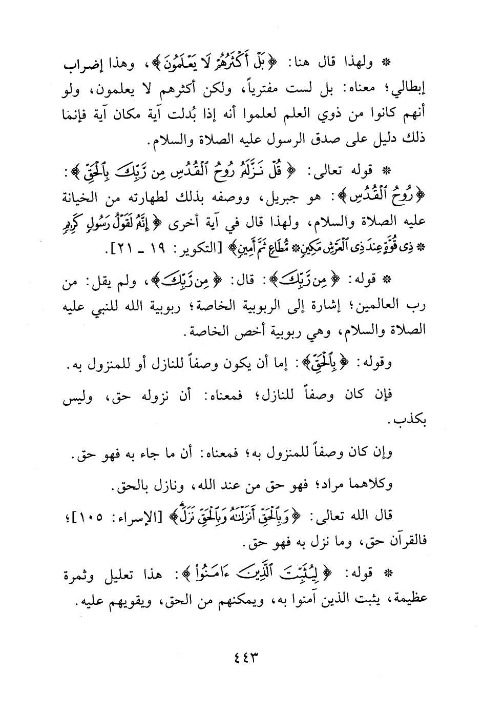 قوله تعالى: {قُلْ نَزَّلَهُ رُوحُ الْقُدُسِ مِنْ رَبِّكَ بِالْحَقِّ}: {رُوحُ الْقُدُسِ}: هو جبريل، ووصفه بذلك لطهارته من الخيانة عليه الصلاة والسلام. ولهذا قال في آية أخرى {إِنَّهُ لَقَوْلُ رَسُولٍ كَرِيمٍ ذِي قُوَّةٍ عِنْدَ ذِي الْعَرْشِ مَكِينٍ} [التكوير:19 - 20].