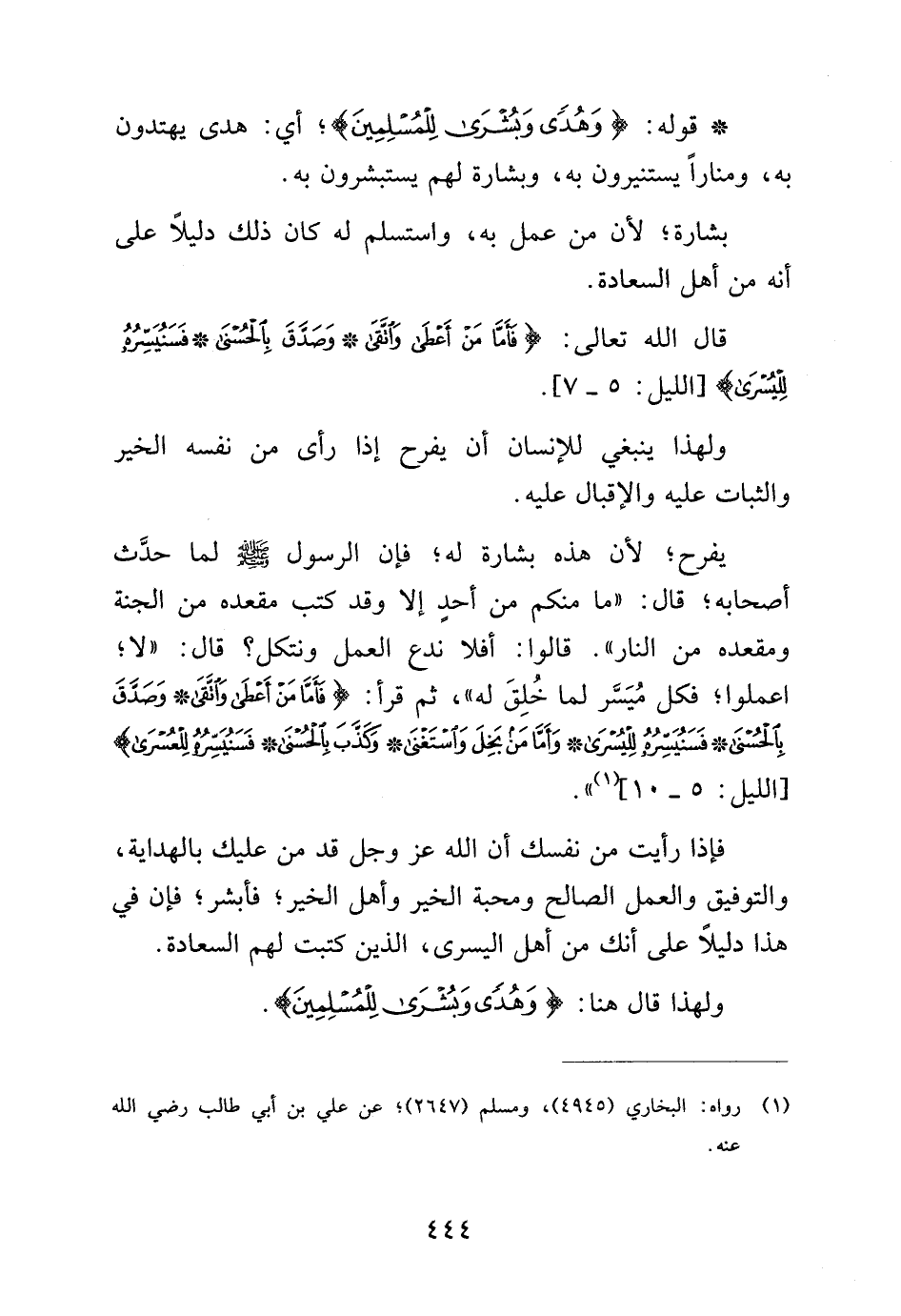 ولهذا ينبغي للإنسان أن يفرح إذا رأى من نفسه الخير والثبات عليه والإقبال عليه، يفرح؛ لأن هذه بشارة له؛ فإن الرسول صلى الله عليه وسلم لما حدث أصحابه؛ قال "ما منكم من أحد إلا وقد كتب مقعده من الجنة ومقعده من النار". قالوا أفلا ندع العمل ونتكل؟ قال: "لا؛ اعملوا؛ فكل ميسر لما خلق له"، ثم قرأ: {فَأَمَّا مَنْ أَعْطَى وَاتَّقَى وَصَدَّقَ بِالْحُسْنَى فَسَنُيَسِّرُهُ لِلْيُسْرَى وَأَمَّا مَنْ بَخِلَ وَاسْتَغْنَى وَكَذَّبَ بِالْحُسْنَى فَسَنُيَسِّرُهُ لِلْعُسْرَى} [الليل: 5 - 10] (¬1) ".
