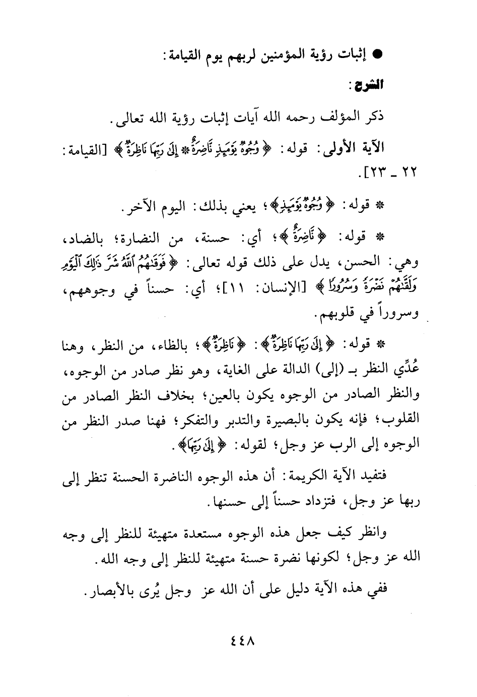 الآية الأولى: قوله: {وُجُوهٌ يَوْمَئِذٍ نَاضِرَةٌ إِلَى رَبِّهَا نَاظِرَةٌ} [القيامة:22 - 23].