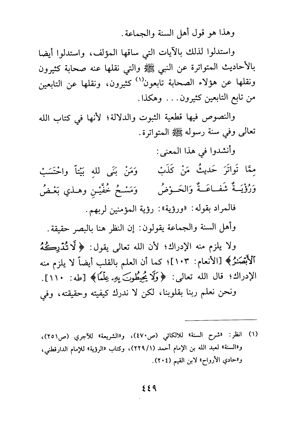(¬1) انظر: "شرح السنة" للالكائي (ص 480) , و"الشريعة" للآجري (ص 251) , "والسنة" لعبد الله بن الإمام أحمد (1/ 299) , وكتاب "الرؤية " للإمام الدارقطني, و"حادي الأرواح" لابن القيم (204).