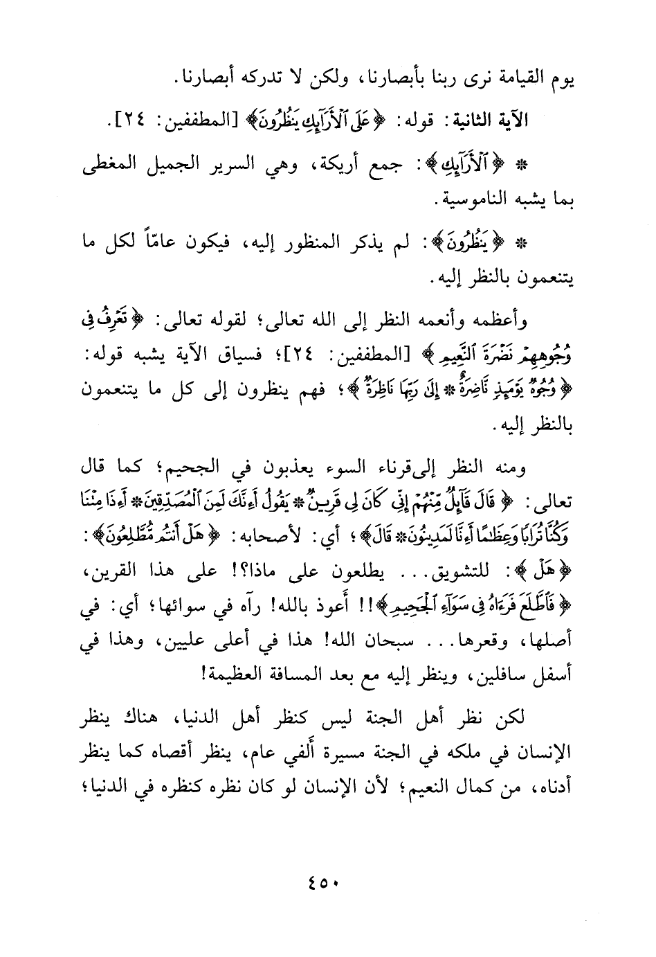 وأعظمه وأنعمه النظر إلى الله تعالى؛ لقوله تعالى: {تَعْرِفُ فِي وُجُوهِهِمْ نَضْرَةَ النَّعِيمِ} [المطففين: 24]؛ فسياق الآية يشبه قوله: {وُجُوهٌ يَوْمَئِذٍ نَاضِرَةٌ إِلَى رَبِّهَا نَاظِرَةٌ}؛ فهم ينظرون إلى كل ما يتنعمون بالنظر إليه.