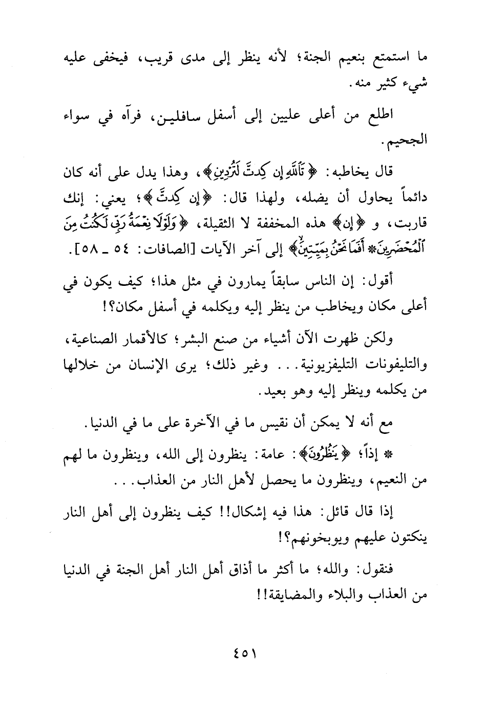 اطلع من أعلى عليين إلى أسفل سافلين، فرآه في سواء الجحيم، قال يخاطبه: {قَالَ تَاللَّهِ إِنْ كِدْتَ لَتُرْدِينِ}؛ وهذا يدل على أنه كان دائماً يحاول أن يضله, ولهذا قال: {إِنْ كِدْتَ} , وهذا يدل على أنه كان دائماً يحاول أن يضله, ولهذا قال: {إِنْ كِدْتَ}؛ يعني: إنك قاربت, و {إِنْ} هذه المخففة لا الثقيلة, {وَلَوْلا نِعْمَةُ رَبِّي لَكُنْتُ مِنَ الْمُحْضَرِينَ أَفَمَا نَحْنُ بِمَيِّتِينَ} إلى آخر الآيات [الصافات: 54 - 58].