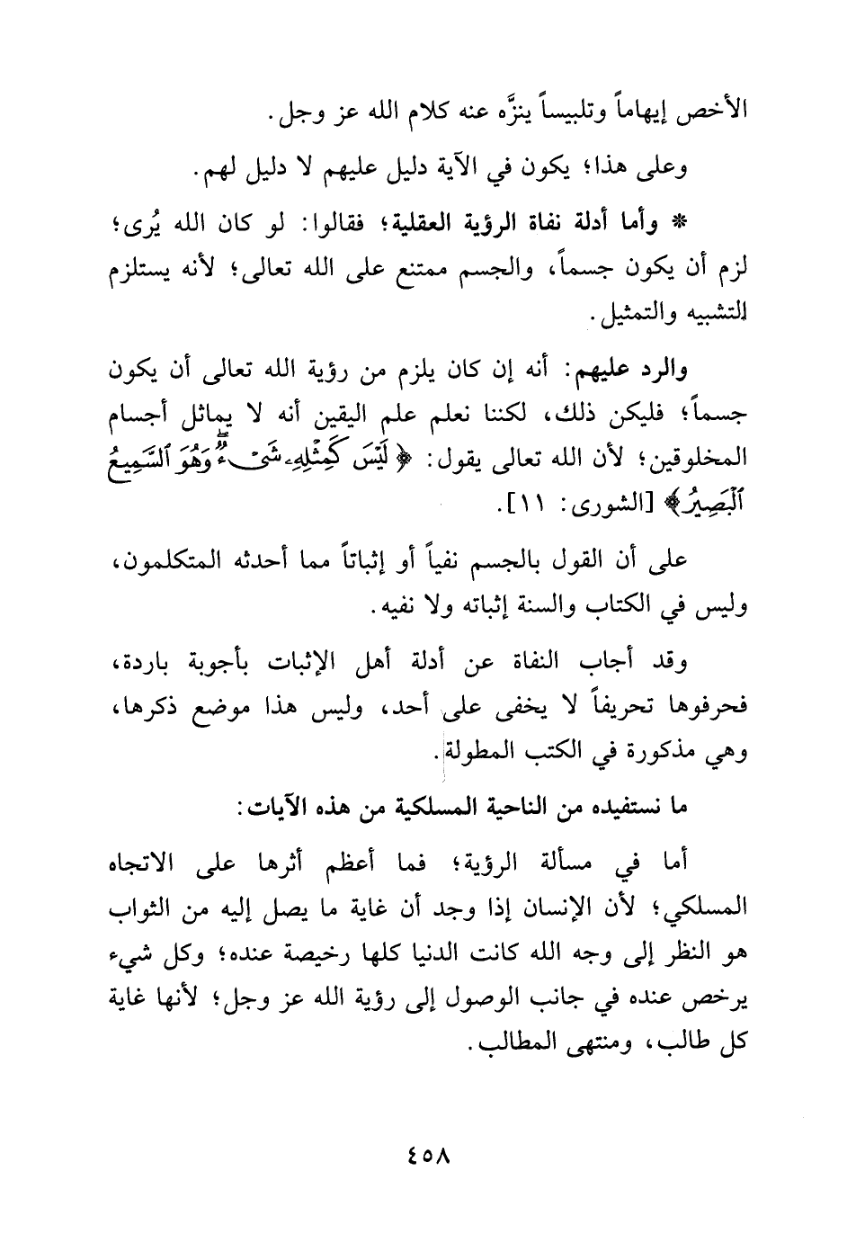 وأما أدلة نفاة الرؤية العقلية؛ فقالوا: لو كان الله يرى لزم أن يكون جسماً والجسم ممتنع على الله تعالى لأنه يستلزم التشبيه والتمثيل.