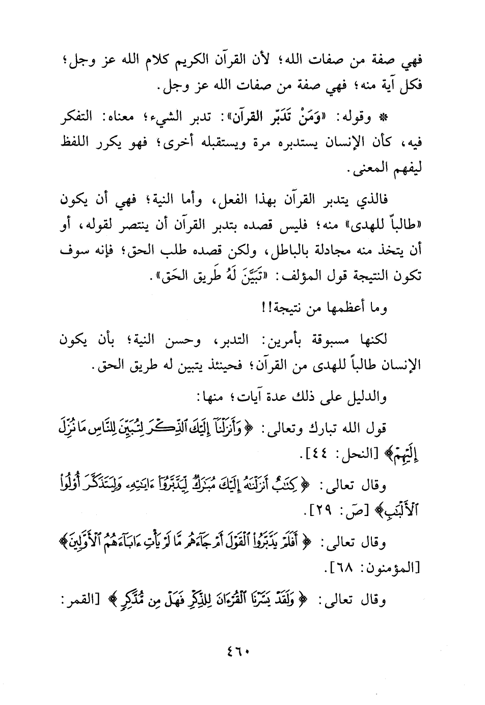 فالذي يتدبر القرآن بهذا الفعل واما النية فهي أن يكون "طالباً للهدى" منه فليس قصده بتدبر القرآن أن ينتصر لقوله, أو أن يتخذ منه مجادلة بالباطل, ولكن قصده طلب الحق فإنه سوف تكون النتيجة قول المؤلف: "تبين له طريق الحق".