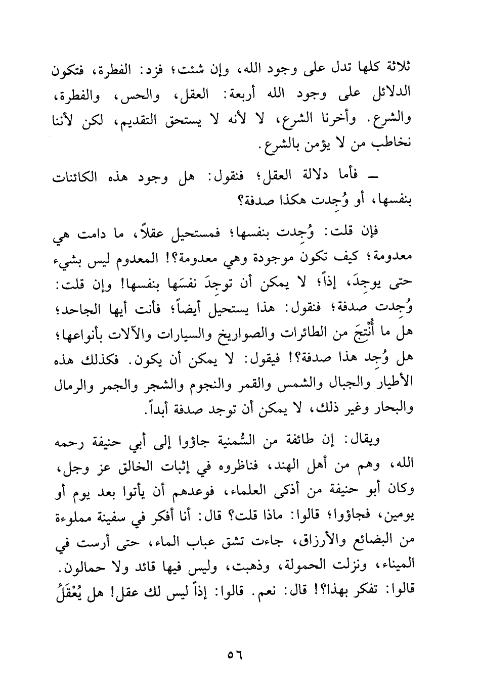 ويقال: إن طائفة من السُّمنية جاؤوا إلى أبي حنيفة رحمه الله، وهم من أهل الهند، فناظروه في إثبات الخالق عز وجل، وكان أبو حنيفة من أذكى العلماء فوعدهم أن يأتوا بعد يوم أو يومين، فجاؤوا، قالوا: ماذا قلت؟ أنا أفكر في سفينة مملوءة من البضائع والأرزاق جاءت تشق عباب الماء حتى أرسلت في الميناء ونزلت الحمولة وذهبت، وليس فيها قائد ولا حمالون.