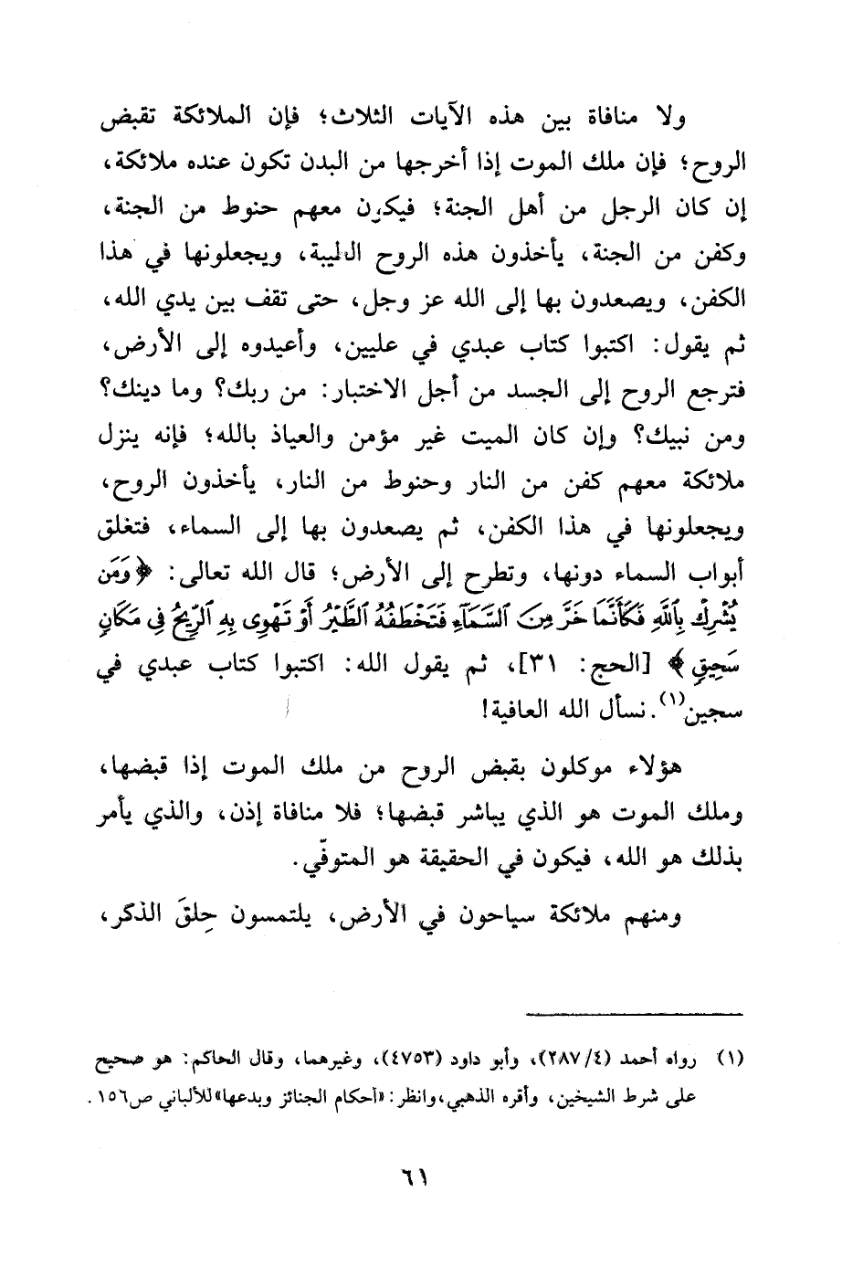 (¬1) رواه أحمد (4/ 287)، وأبو داود/ كتاب السنة/ باب في المسألة في القبر، وأبو داود (4753) وغيرهما, والحاكم (1/ 93) وقال: "صحيح على شرط الشيخين" وأقره الذهبي، وقال الهيثمي: "رواه أحمد ورجاله رجال الصحيح" 3/ 49 , وانظر أحكام الجنائز وبدعها للألباني ص 156.