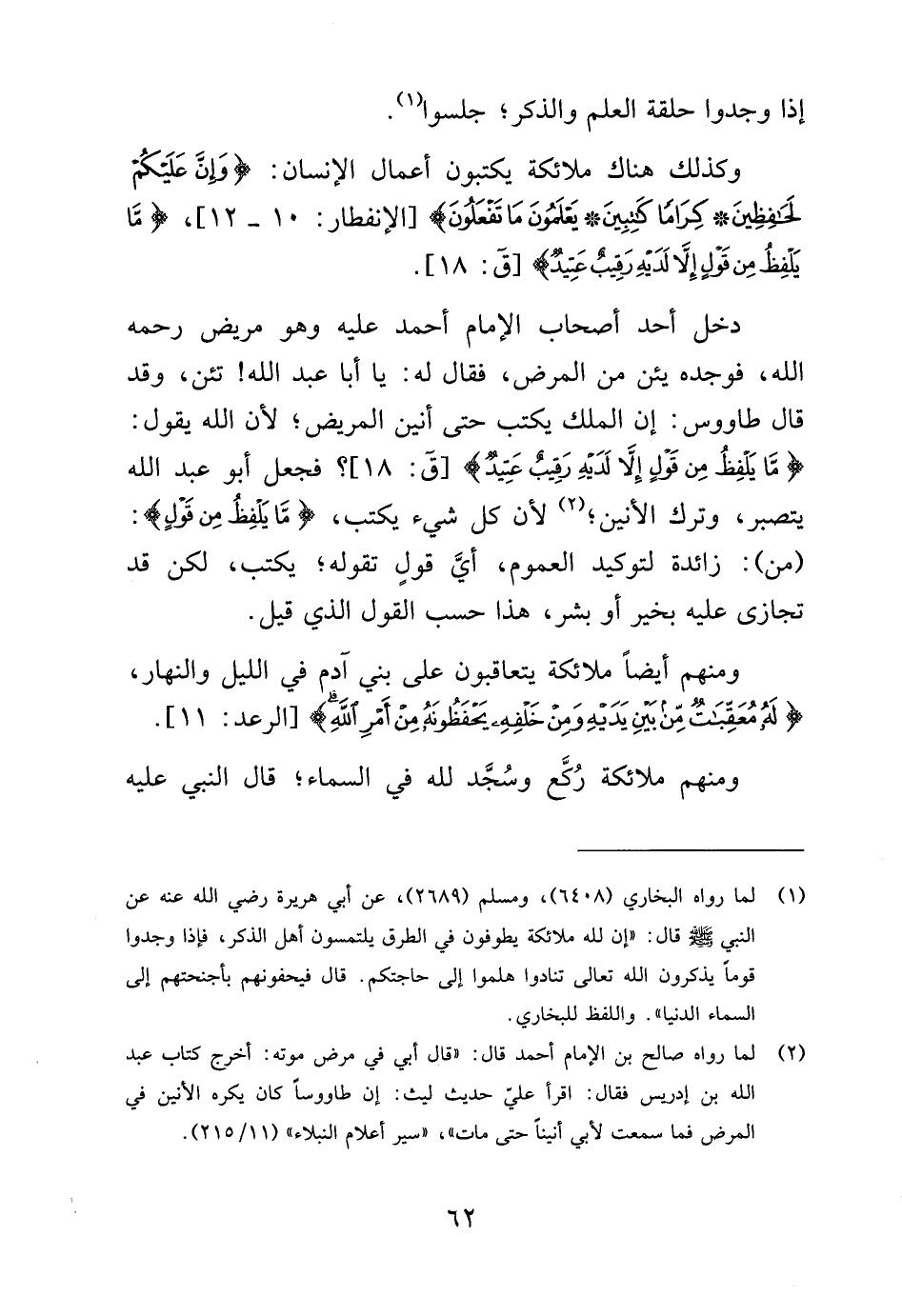 (¬1) لما رواه البخاري (6408) في كتاب الدعوات/ باب فضل ذكر الله عز وجل، ومسلم (2689) عن أبي هرية رضيالله عنه عن النبي صلى الله عليه وسلم قال: "إن لله ملائكة يطوفون في الطرق يلتمسون أهل الذكر, وجدوا قوماً يذكرون الله تعالى تنادوا هلما إلى حاجتكم. قال فيحفونهم بأجنحتهم إلى السماء الدنياء". واللفظ للبخاري في كتاب الدعوات/ باب فضل مجالس الذكر.