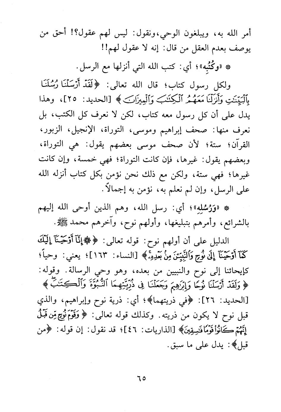 ولكل رسول كتاب، قال الله تعالى: {لَقَدْ أَرْسَلْنَا رُسُلَنَا بِالْبَيِّنَاتِ وَأَنْزَلْنَا مَعَهُمُ الْكِتَابَ وَالْمِيزَانَ} [الحديد: 25]، وهذا يدل على أن كل رسول معه كتاب، لكن لا نعرف كل الكتب، بل نعرف كل الكتب، بل نعرف منها: صحف إبراهيم وموسى، التوراة، الإنجيل، الزبور، القرآن، ستة، لأن صحف موسى بعضهم يقول: هي التوراة، وبعضهم يقول: غيرها، فإن كانت التوراة، فهي خمسة، وإن كانت غيرها، فهي ستة، ولكن مع ذلك نحن نؤمن بكل كتاب أنزله الله على الرسل، وإن لم نعلم به، نؤمن به إجمالاً.