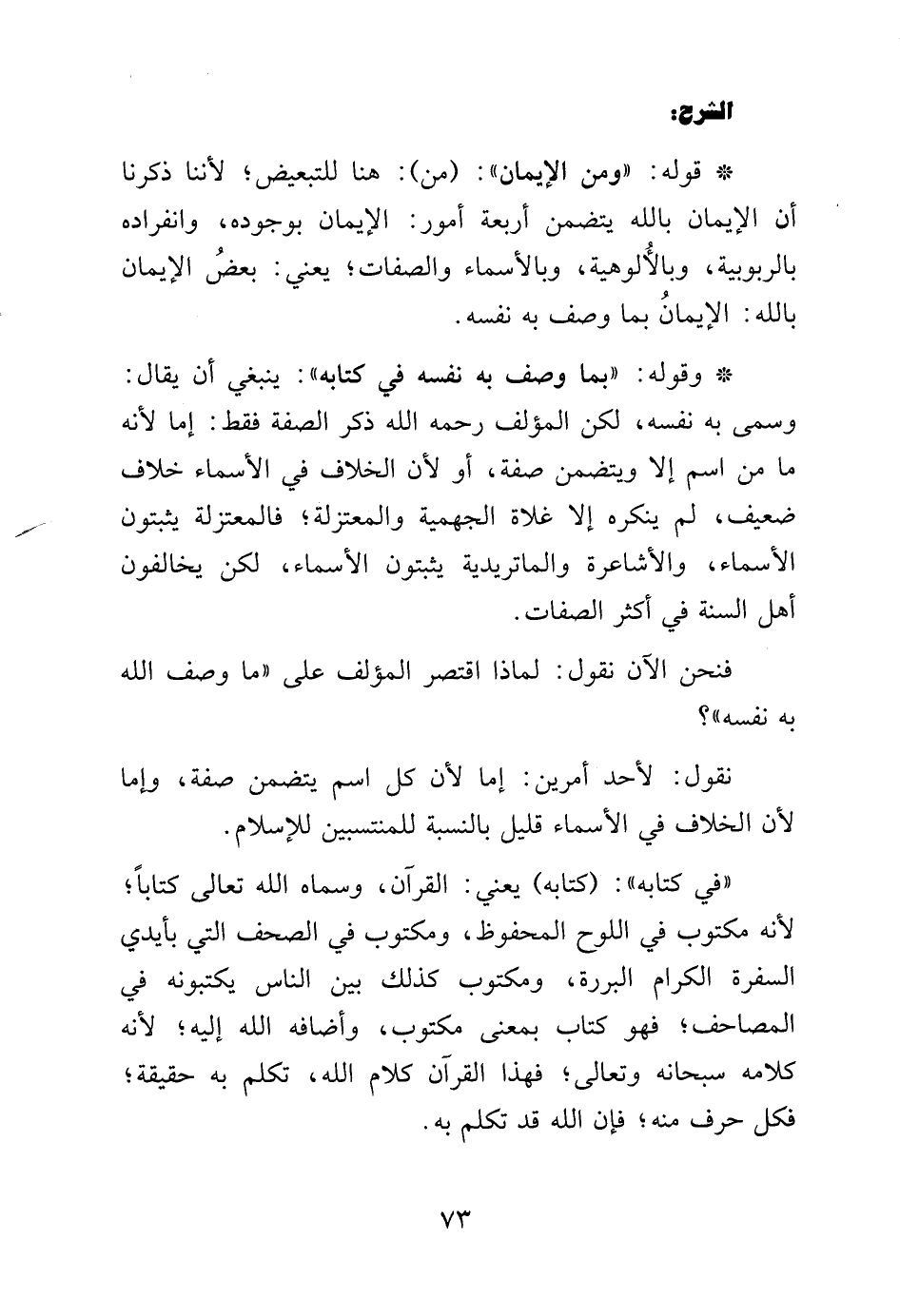 قوله: "بما وصف به نفسه في كتابه" ينبغي أن يقال: وسمى به نفسه لكن المؤلف رحمه الله ذكر الصفة فقط: إما لأنه ما من اسم إلا ويتضمن صفة، أو لأن الخلاف في الأسماء خلاف ضعيف، لم ينكره إلاّ غلاة الجهمية والمعتزلة، فالمعتزلة يثبتون الأسماء، والأشاعرة والماتريدية يثبتون الأسماء، لكن يخالفون أهل السنة في أكثر الصفات.