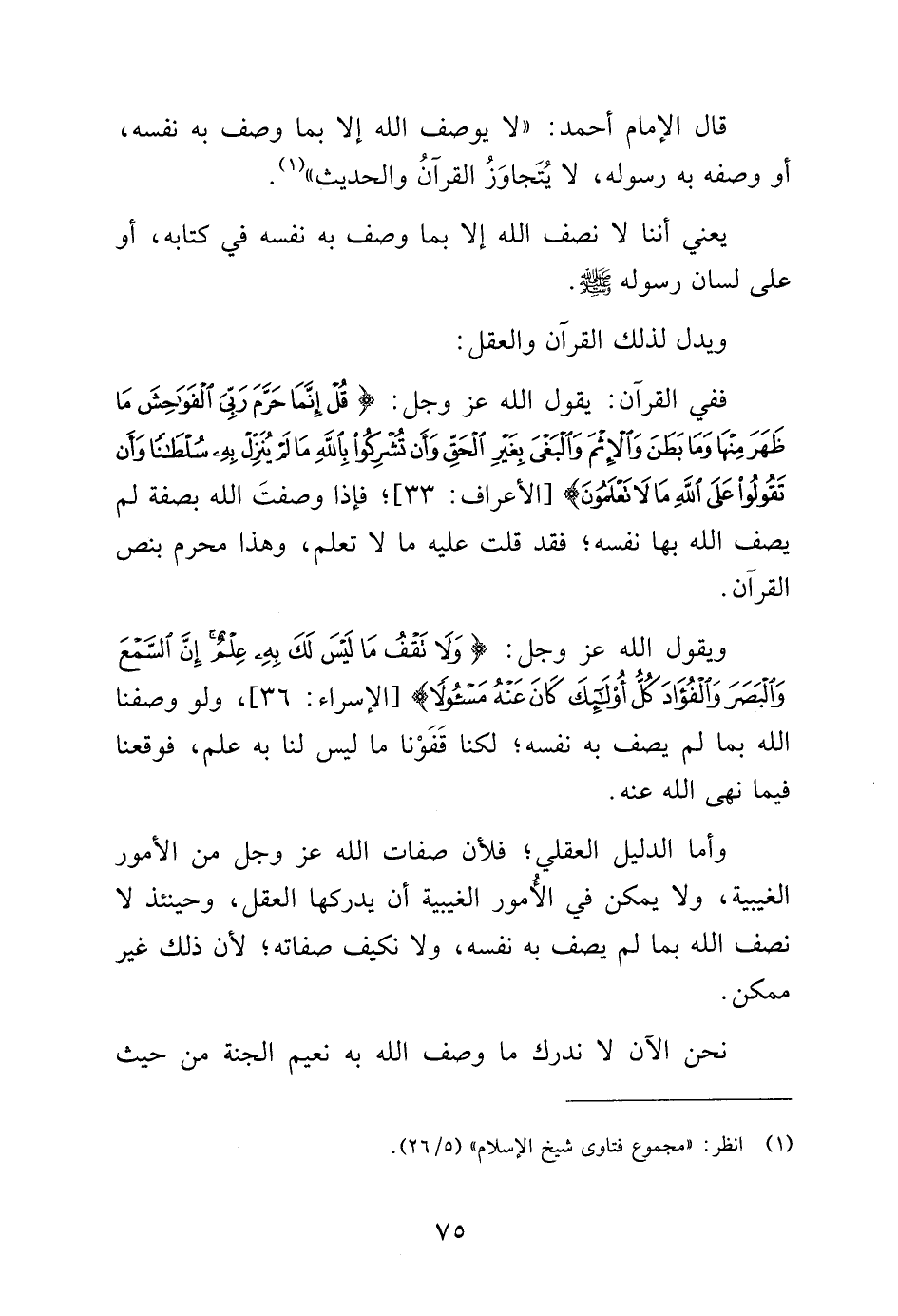 ويقول الله عز وجل: {وَلا تَقْفُ مَا لَيْسَ لَكَ بِهِ عِلْمٌ إِنَّ السَّمْعَ وَالْبَصَرَ وَالْفُؤَادَ كُلُّ أُولَئِكَ كَانَ عَنْهُ مَسْؤُولاً} [الإسراء: 36]، ولو وصفنا الله بما لم يصف به نفسه، لكنا قفونا ما ليس لنا به علم، فوقعنا فيما نهى الله عنه.