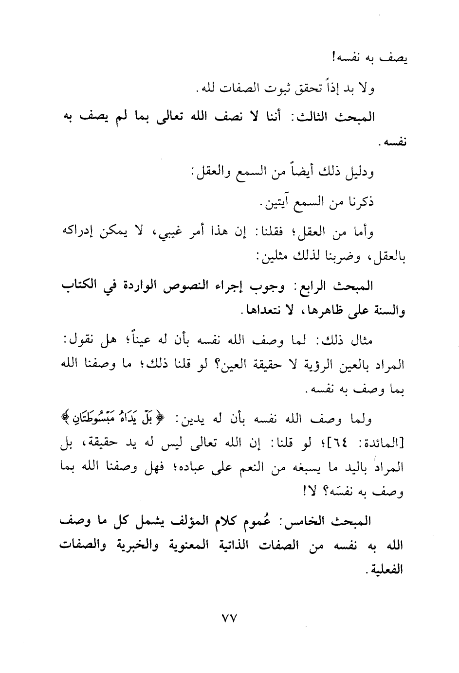 ولما وصف الله نفسه بأن له يدين: {بَلْ يَدَاهُ مَبْسُوطَتَانِ} [المائدة: 64]، لو قلنا: إن الله تعالى ليس له يد حقيقة، بل المراد باليد ما يسبغه من النعم على عباده، فهل وصفنا الله بما وصف به نفسه؟ لا!