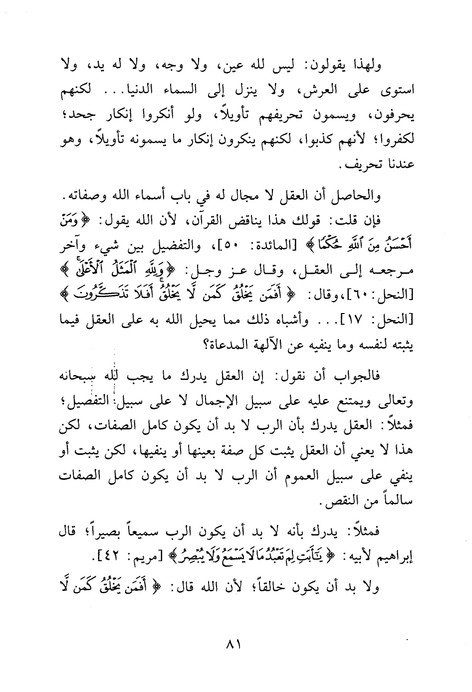 والحاصل أن العقل لا مجال له في باب أسماء الله وصفاته فإن قلت: قولك هذا يناقض القرآن، لأن الله يقول: {وَمَنْ أَحْسَنُ مِنَ اللَّهِ حُكْماً} [المائدة: 50] والتفضيل بين شيء وآخر مرجعه إلى العقل وقال عز وجل {لِلَّهِ الْمَثَلُ الأَعْلَى} [النحل: 60] وقال: {أَفَمَنْ يَخْلُقُ كَمَنْ لا يَخْلُقُ أَفَلا تَذَكَّرُونَ} [النحل: 17] وأشباه ذلك مما يحيل الله به على العقل فيما يثبته لنفسه وما ينفيه عن الآلهة المدعاة؟