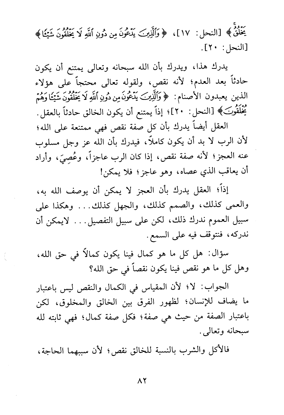يدرك هذا ويدرك بأن الله سبحانه وتعالى يمتنع أن يكون حادثاً بعد العدم، لأنه نقص، ولقوله تعالى محتجاً على هؤلاء الذين يعبدون الأصنام: {وَالَّذِينَ يَدْعُونَ مِنْ دُونِ اللَّهِ لا يَخْلُقُونَ شَيْئاً وَهُمْ يُخْلَقُونَ} [النحل: 20]، إذاً يمتنع أن يكون الخالق حادثاً بالعقل.