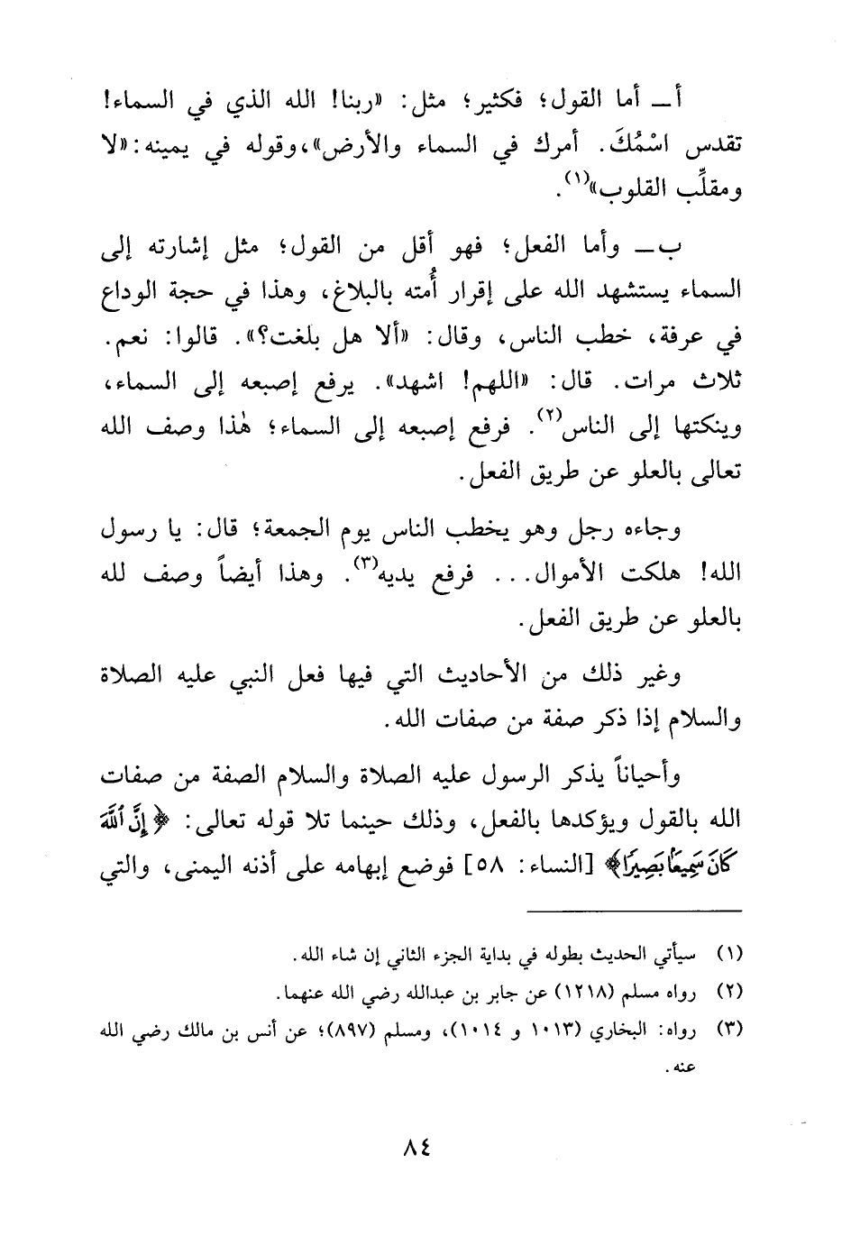 ب- وأما الفعل، فهو أقل من القول، مثل إشارته إلى السماء يستشهد الله على إقرار أمته بالبلاغ، وهذا في حجة الوداع في عرفة، خطب الناس، وقال: "ألا هل بلغت؟ " قالوا: نعم ثلاث مرات. قال "اللهم! أشهد" يرفع إصبعه إلى السماء، وينكتها إلى الناس (¬3) فرفع إصبعه إلى السماء، هذا وصف الله تعالى بالعلو عن طريق الفعل.