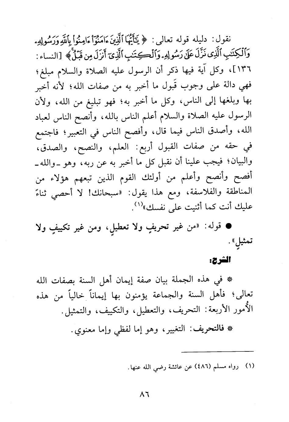 نقول: دليله قوله تعالى: {يَا أَيُّهَا الَّذِينَ آمَنُوا آمِنُوا بِاللَّهِ وَرَسُولِهِ وَالْكِتَابِ الَّذِي نَزَّلَ عَلَى رَسُولِهِ وَالْكِتَابِ الَّذِي أَنْزَلَ مِنْ قَبْلُ} [النساء: 136]، وكل آية فيها ذكر أن الرسول عليه الصلاة والسلام مبلغ، فهي دالة على وجوب قبول ما أخبر به من صفات الله، لأنه أخبر بها وبلغها إلى الناس، وكل ما أخبر به، فهو تبليغ من الله، ولأن الرسول عليه الصلاة والسلام أعلم الناس بالله وأنصح الناس لعباد الله وأصدق الناس فيما قال، وأفصح الناس في التعبير، فاجتمع في حقه من صفات القبول أربع: العلم والنصح، والصدق، والبيان، فيجب علينا أن نقبل كل ما أخبر به عن ربه، وهو ـ والله ـ أفصح وأنصح وأعلم من أولئك القوم الذين تبعهم هؤلاء من المناطقة والفلاسفة، ومع هذا يقول: "سبحان لا أحصي ثناء عليك أنت كما أثنيت على نفسك" (¬1).
