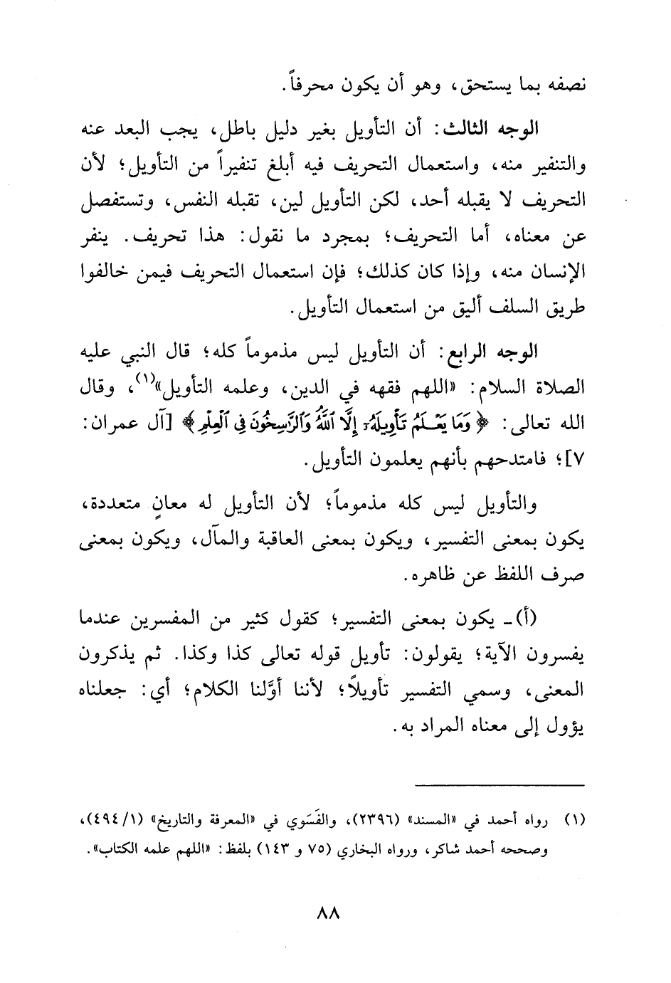 الوجه الرابع: أن التأويل ليس مذموماً كله، قال النبي عليه الصلاة والسلام: "اللهم فقهه في الدين، وعلمه التأويل" (¬1) ,وقال الله تعالى: {وَمَا يَعْلَمُ تَأْوِيلَهُ إِلاّ اللَّهُ وَالرَّاسِخُونَ فِي الْعِلْمِ} [آل عمران: 7]، فامتدحهم بأنهم يعلمون التأويل.