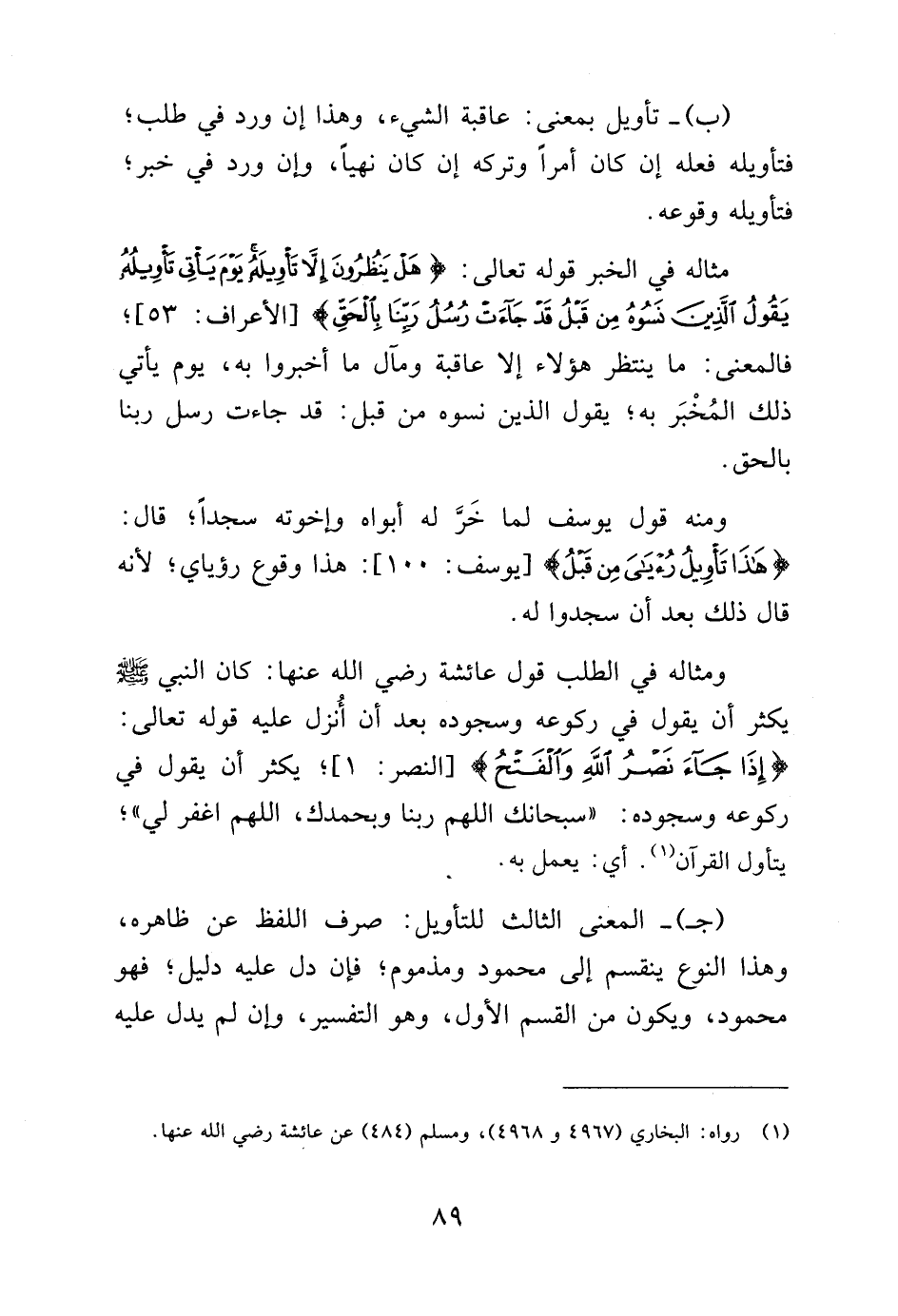 ومثاله في الطلب قول عائشة رضي الله عنها: كان النبي صلى الله عليه وسلم يكثر أن يقول في ركوعه وسجوده بعد أن أنزل عليه قوله تعالى: {إِذَا جَاءَ نَصْرُ اللَّهِ وَالْفَتْحُ} [النصر: 1]، يكثر أن يقول في ركوعه وسجوده: "سبحانك اللهم ربنا وبحمدك، اللهم اغفر لي"، يتأول القرآن (¬1). أي: يعمل به.