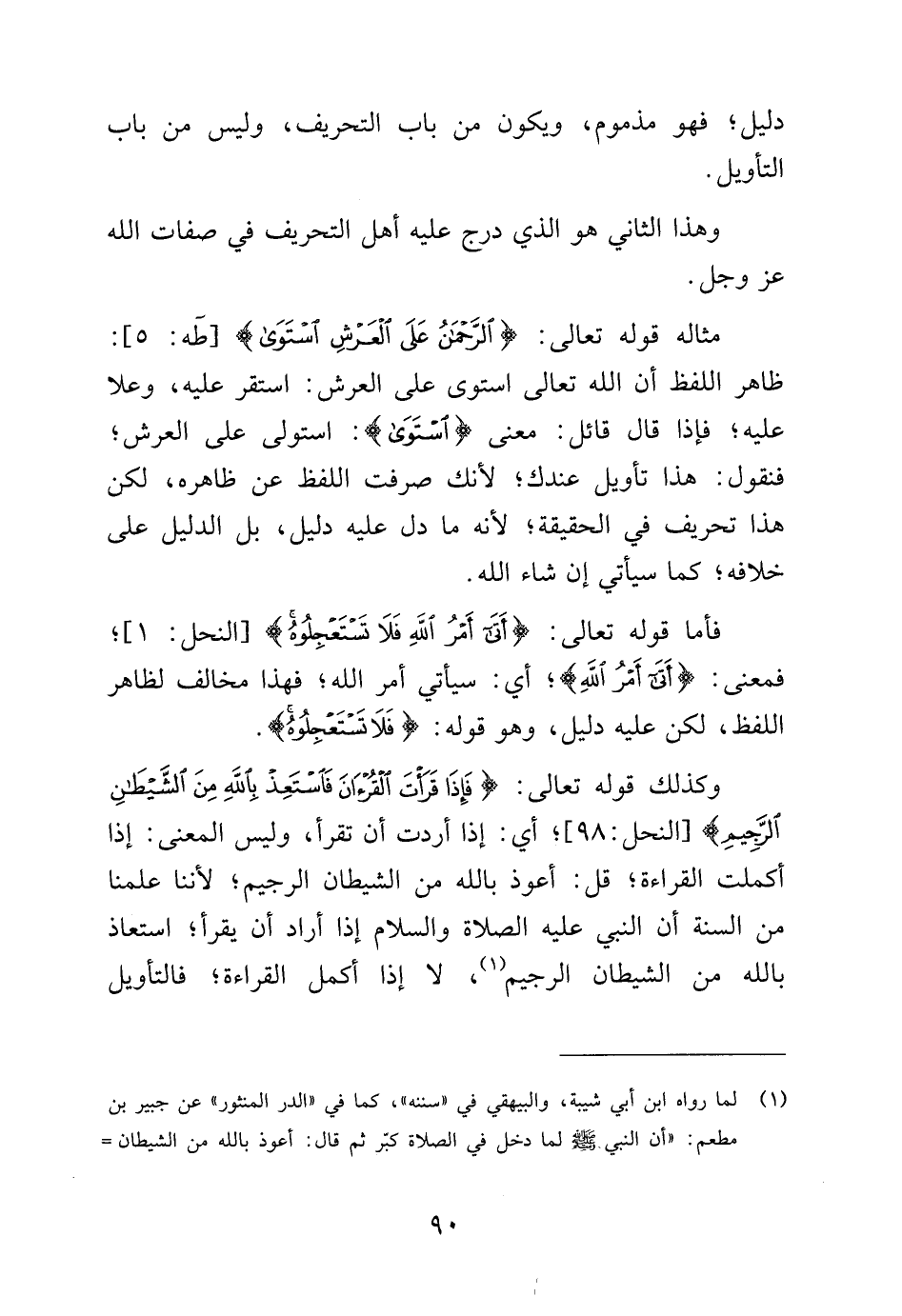 وكذلك قوله تعالى: {فَإِذَا قَرَأْتَ الْقُرْآنَ فَاسْتَعِذْ بِاللَّهِ مِنَ الشَّيْطَانِ الرَّجِيمِ} [النحل: 98]، أي: إذا أردت أن تقرأ، وليس المعني: إذا أكملت القراءة، قل: أعوذ بالله من الشيطان الرجيم، لأننا علمنا من السنة أن النبي عليه الصلاة والسلام إذا أرد أن يقرأ، استعاذ بالله من الشيطان الرجيم (¬1)، لا إذا أكمل القراءة، فالتأويل