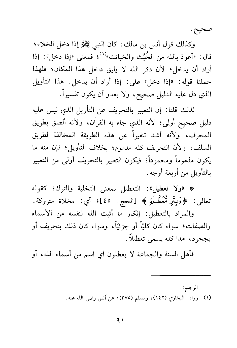 وكذلك قول أنس بن مالك: كان النبي صلى الله عليه وسلم إذا دخل الخلاء، قال: "أعوذ بالله من الخبث والخبائث" (¬1)، فمعنى "إذا دخل": إذاً أراد أن يدخل، لأن ذكر الله لا يليق داخل هذا المكان، فلهذا حملنا قوله "إذا دخل" على: إذ أراد أن يدخل: هذا التأويل الذي دل عليه صحيح، ولا يعدوا أن يكون تفسيراً.