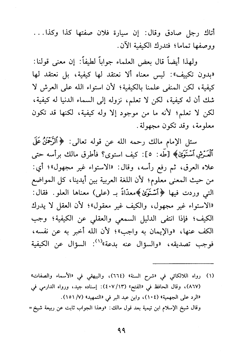 (¬1) رواه اللالكائي في "شرح السنة" (664)، والبيهقي في "الأسماء والصفات (867)، وأبو نعيم في الحلية (6/ 325)، ورواه الدارمي في "الرد على الجهمية" (104)، وابن عبد البرفي "التمهيد" (7/ 151). قال ابن حجر "إسناده جيد" (الفتح: 13/ 407). وقال شيخ الإسلام ابن تيمية بعد قول مالك: "وهذا الجواب ثابت عن ربيعة شيخ مالك، وقد روي هذا الجواب عن أم سلمة رضي الله عنها موقوفاً ومرفوعاً، ولكن ليس في إسناده مما يعتمد عليه، وهكذا سائر قولهم يوافق مالك" "مجموع الفتاوى" (5/ 365).