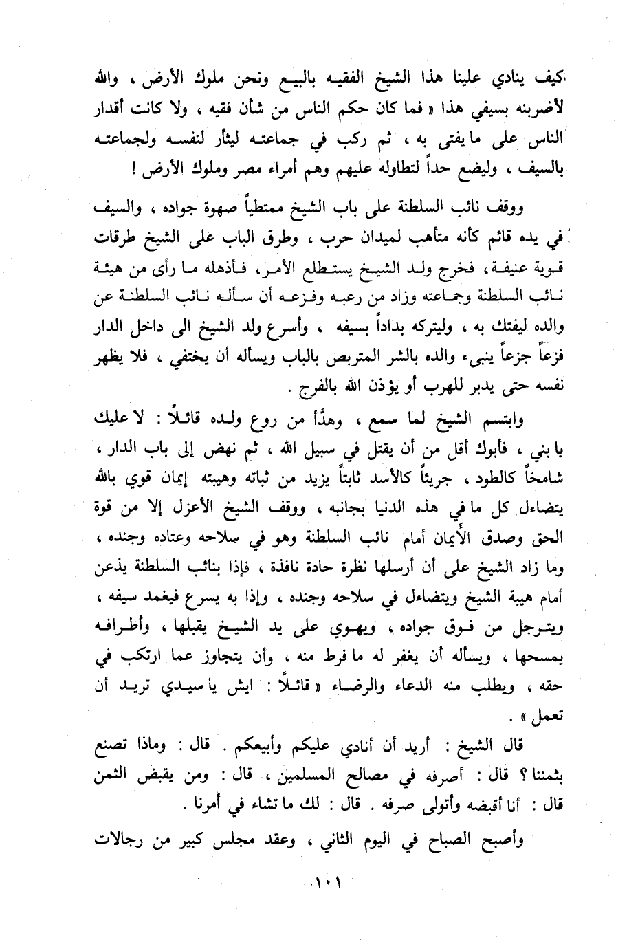 كيف ينادي علينا هذا الشيخ الفقيه بالبيع ونحن ملوك الأرض، واللّه لأضربنه بسيفي هذا «فما كان حكم الناس من شأن فقيه، ولا كانت أقدار الناس على ما يفتى به، ثم ركب في جماعته ليثأر لنفسه ولجماعته بالسيف، وليضع حدا لتطاوله عليهم وهم أمراء مصر وملوك الأرض!