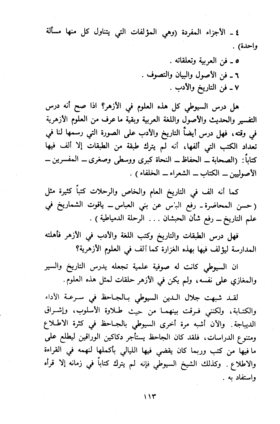 لقد شبهت جلال الدين السيوطي بالجاحظ في سرعة الأداء والكتابة، ولكنني فرقت بينهما من حيث طلاوة الأسلوب، وإشراق الديباجة. والآن أشبه مرة أخرى السيوطي بالجاحظ في كثرة الاطلاع ومتنوع الدراسات، فلقد كان الجاحظ يستأجر دكاكين الوراقين ليطلع على ما فيها من كتب وربما كان يقضي فيها الليالي بأكملها لنهمه في القراءة والاطلاع. وكذلك الشيخ السيوطي فإنه لم يترك كتابا في زمانه إلا قرأه واستفاد به.