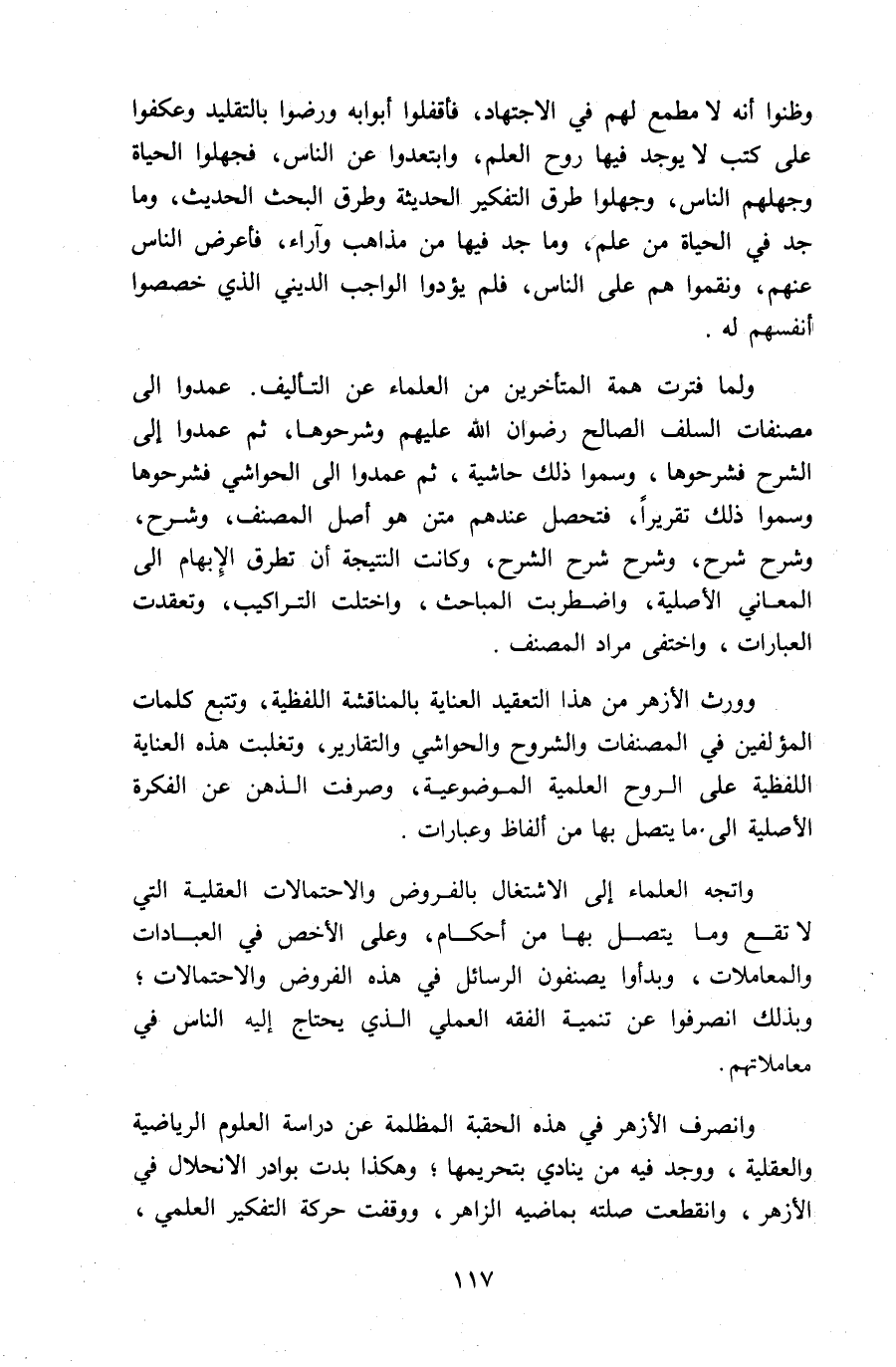 وظنوا أنه لا مطمع لهم في الاجتهاد، فأقفلوا أبوابه ورضوا بالتقليد وعكفوا على كتب لا يوجد فيها روح العلم، وابتعدوا عن الناس، فجهلوا الحياة وجهلهم الناس، وجهلوا طرق التفكير الحديثة وطرق البحث الحديث، وما جد في الحياة من علم، وما جد فيها من مذاهب وآراء، فأعرض الناس عنهم، ونقموا هم على الناس، فلم يؤدوا الواجب الديني الذي خصصوا أنفسهم له.