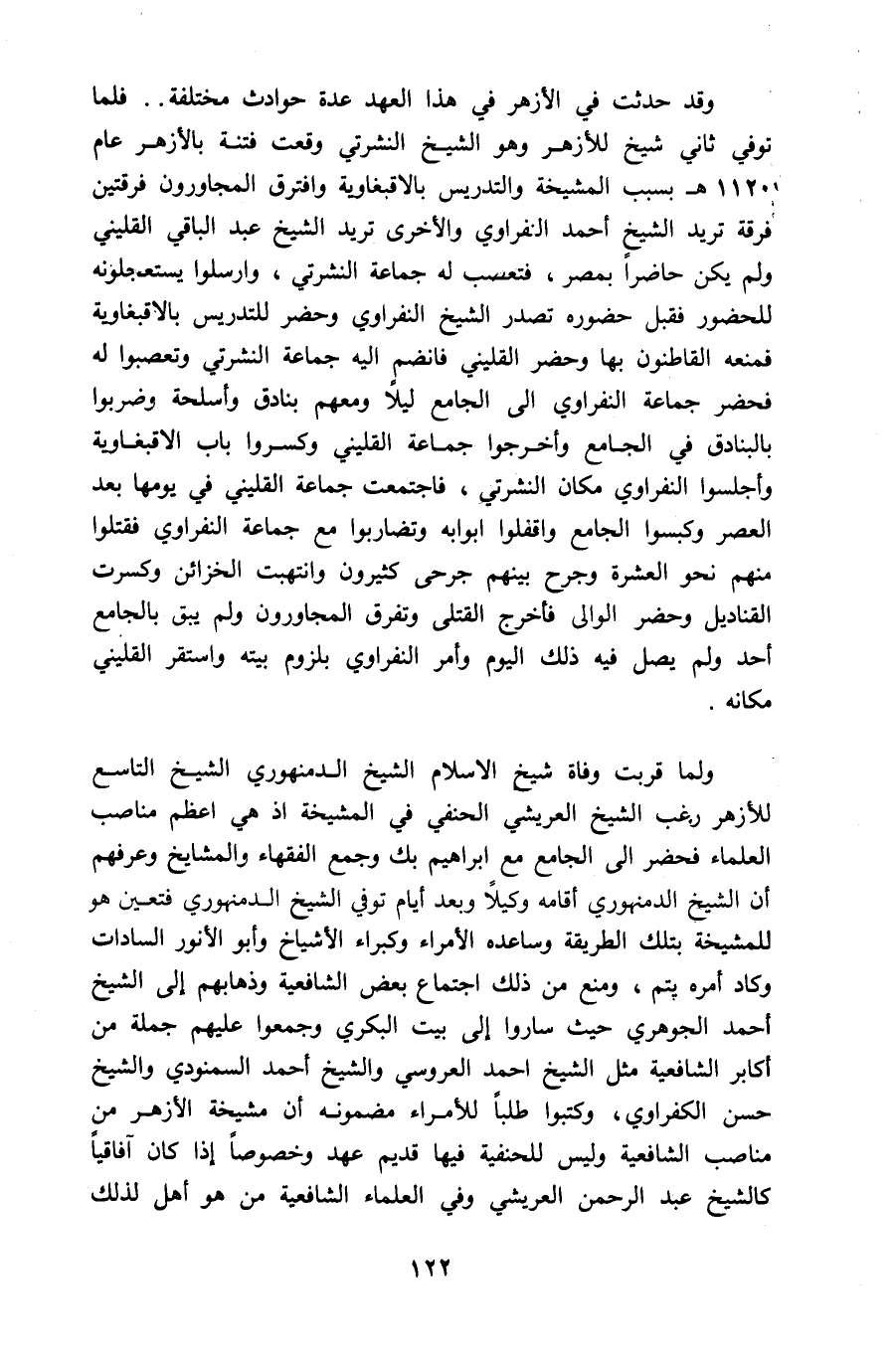 وقد حدثت في الأزهر في هذا العهد عدة حوادث مختلفة. . فلما توفي ثاني شيخ للأزهر وهو الشيخ النشرتي وقعت فتنة بالأزهر عام 1120 ه بسبب المشيخة والتدريس بالاقبغاوية وافترق المجاورون فرقتين فرقة تريد الشيخ أحمد النفراوي والأخرى تريد الشيخ عبد الباقي القليني ولم يكن حاضرا بمصر، فتعصب له جماعة النشرتي، وارسلوا يستعجلونه للحضور فقبل حضوره تصدر الشيخ النفراوي وحضر للتدريس بالاقبغاوية فمنعه القاطنون بها وحضر القليني فانضم اليه جماعة النشرتي وتعصبوا له فحضر جماعة النفراوي الى الجامع ليلا ومعهم بنادق وأسلحة وضربوا بالبنادق في الجامع وأخرجوا جماعة القليني وكسروا باب الاقبغاوية وأجلسوا النفراوي مكان النشرتي، فاجتمعت جماعة القليني في يومها بعد العصر وكبسوا الجامع واقفلوا ابوابه وتضاربوا مع جماعة النفراوي فقتلوا منهم نحو العشرة وجرح بينهم جرحى كثيرون وانتهبت الخزائن وكسرت القناديل وحضر الوالى فأخرج القتلى وتفرق المجاورون ولم يبق بالجامع أحد ولم يصل فيه ذلك اليوم وأمر النفراوي بلزوم بيته واستقر القليني مكانه.