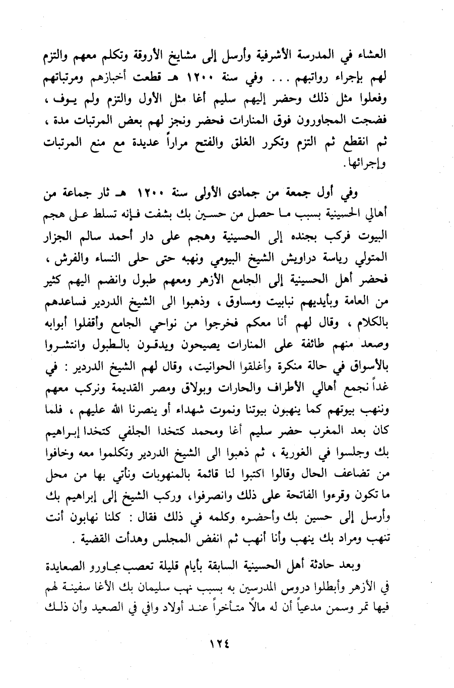 العشاء في المدرسة الأشرفية وأرسل إلى مشايخ الأروقة وتكلم معهم والتزم لهم بإجراء رواتبهم. . . وفي سنة 1200 ه قطعت أخبازهم ومرتباتهم وفعلوا مثل ذلك وحضر إليهم سليم أغا مثل الأول والتزم ولم يوف، فضجت المجاورون فوق المنارات فحضر ونجز لهم بعض المرتبات مدة، ثم انقطع ثم التزم وتكرر الغلق والفتح مرارا عديدة مع منع المرتبات وإجرائها.