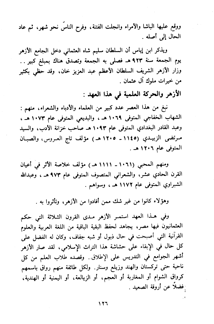 وفي هذا العهد استمر الأزهر مدى القرون الثلاثة التي حكم العثمانيون فيها مصر، يجاهد لحفظ البقية الباقية من اللغة العربية والعلوم القرآنية التي أصبحت في حال ذبول أو شبه جفاف، وكان له الفضل على كل حال في الإبقاء على حشاشة هذا التراث الإسلامي، لقد صار الأزهر أشهر الجوامع في التدريس على الإطلاق. وقصده طلاب العلم من كل ناحية حتى تركستان والهند وزيلع وسنار. ولكل طائفة منهم رواق باسمهم كرواق الشوام أو المغاربة أو العجم، أو الزيالعة، أو اليمنية أو الهندية، فضلا عن أروقة الصعيد.