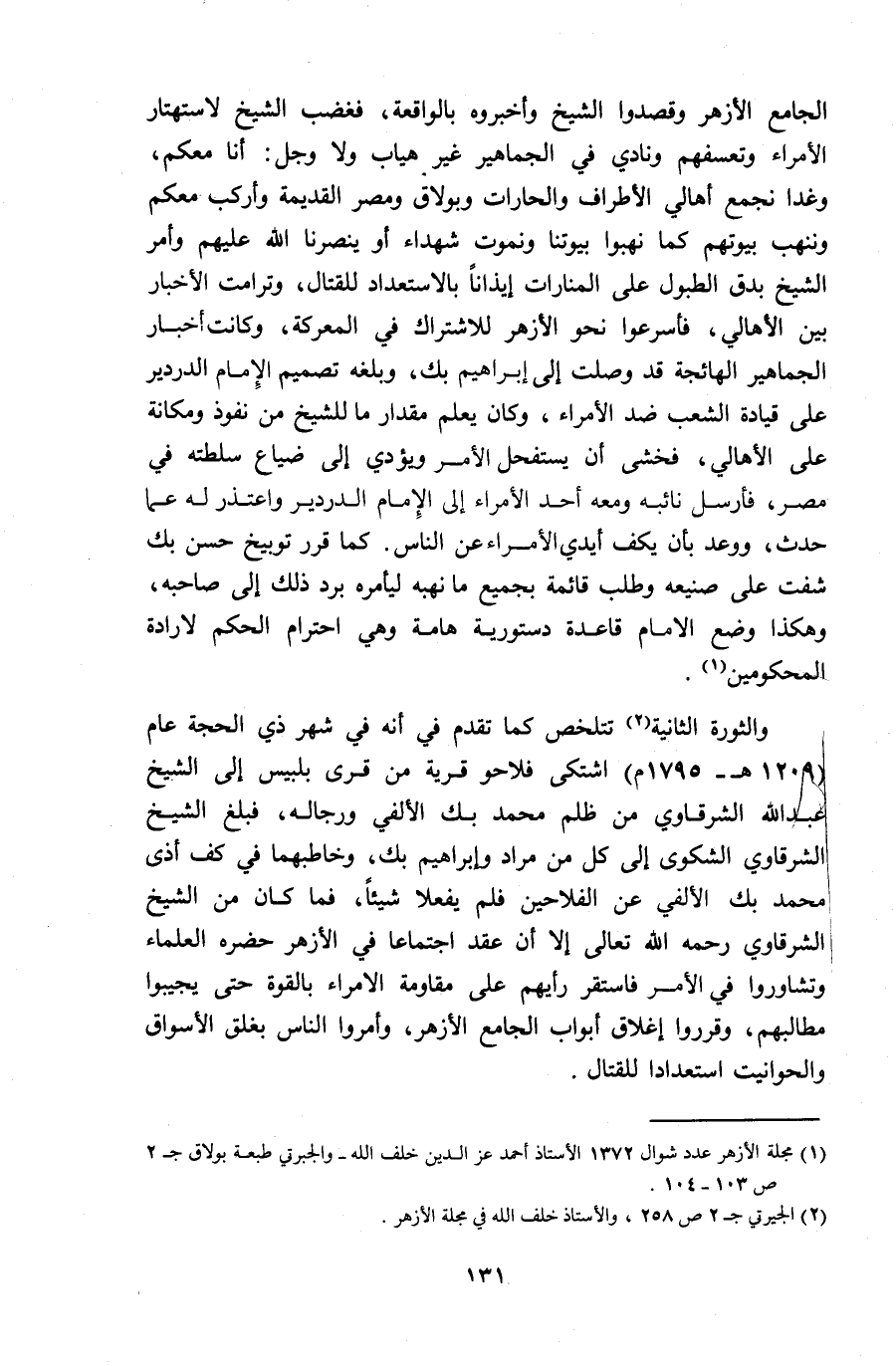 1) مجلة الأزهر عدد شوال 1372 الأستاذ أحمد عز الدين خلف الله-و الجبرتي طبعة بولاق ج 2 ص 103 - 104.