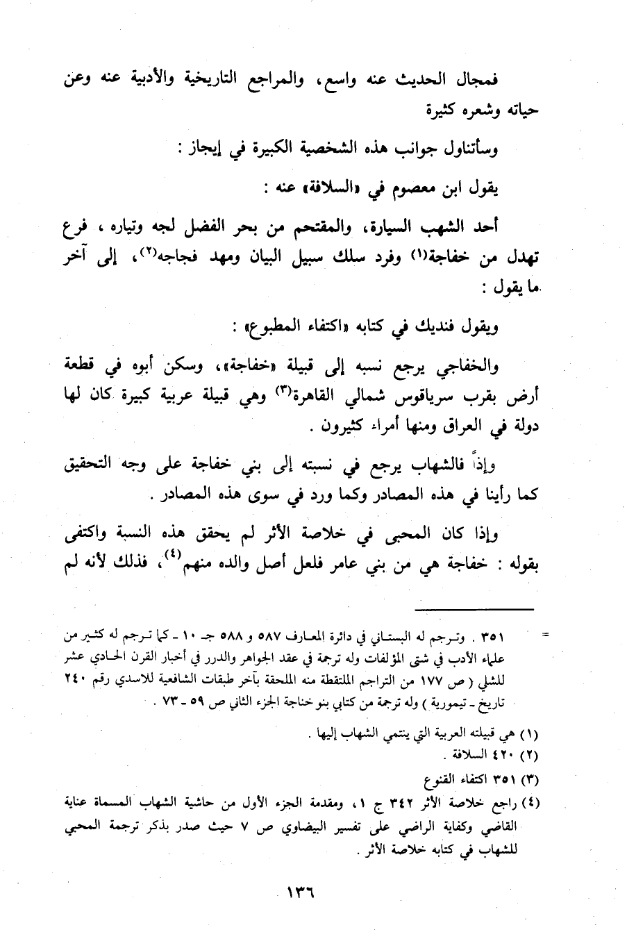 4) راجع خلاصة الأثر 342 ج 1، ومقدمة الجزء الأول من حاشية الشهاب المسماة عناية القاضي وكفاية الراضي على تفسير البيضاوي ص 7 حيث صدر بذكر ترجمة المحبي للشهاب في كتابه خلاصة الأثر.