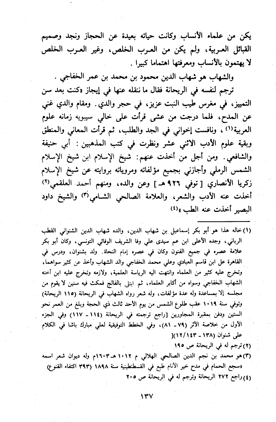1) خاله هذا هو أبو بكر إسماعيل بن شهاب الدين، والده شهاب الدين الشنواني القطب الرباني، وجده الأعلى ابن عم سيدى علي وفا الشريف الوفائي التونسي، وكان أبو بكر علامة عصره في جميع الفنون وكان في عصره إمام النحاة. ولد بشنوان، ودرس في القاهرة على ابن قاسم العبادي وعلي محمد الخفاجي والد الشهاب وأخذ عن كثير سواهما، وتخرج عليه كثير من العلماء وانتهت اليه الرياسة العلمية، ولازمه وتخرج عليه ابن أخته الشهاب الخفاجي وسواه من أكابر العلماء، ثم ابتلى بالفالج فمكث فيه سنين لا يقوم من مجلسه إلا بمساعدة وله عدة مؤلفات، وله شعر رواه الشهاب في الريحانة (115 الريحانة) وتوفي سنة 1019 عقب طلوع الشمس من يوم الأحد ثالث ذي الحجة وبلغ من العمر نحو الستين ودفن بمقبرة المجاورين [راجع ترجمته في الريحانة (114 - 117) وفي الجزء الأول من خلاصة الأثر (79 - 81)، وفي الخطط التوفيقية لعلي مبارك باشا في الكلام على شنوان (138 - 143/ 12)]
