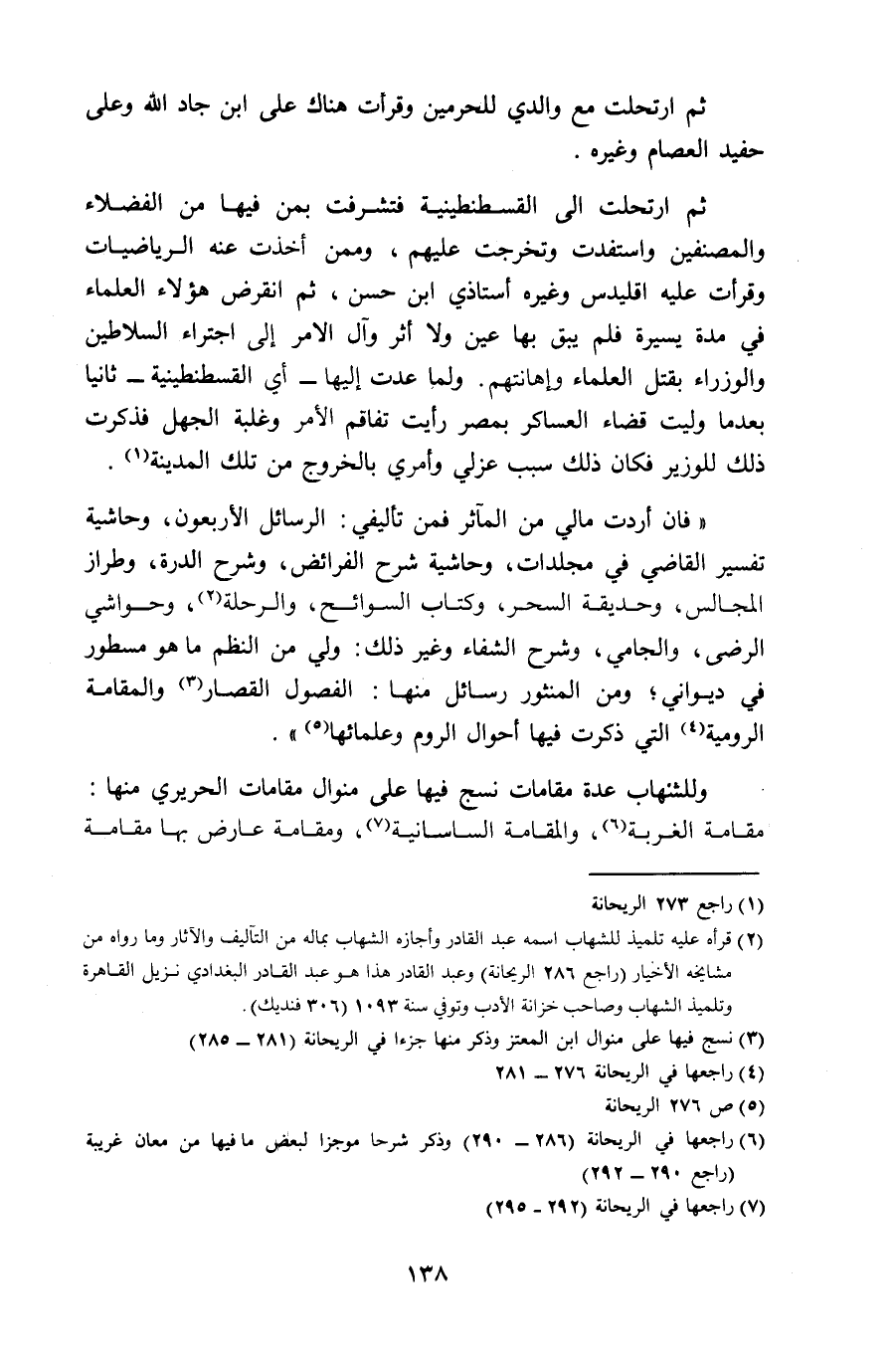2) قرأه عليه تلميذ للشهاب اسمه عبد القادر وأجازه الشهاب بماله من التآليف والآثار وما رواه من مشايخه الأخيار (راجع 286 الريحانة) وعبد القادر هذا هو عبد القادر البغدادي نزيل القاهرة وتلميذ الشهاب وصاحب خزانة الأدب وتوفي سنة 1093 (306 فنديك).
