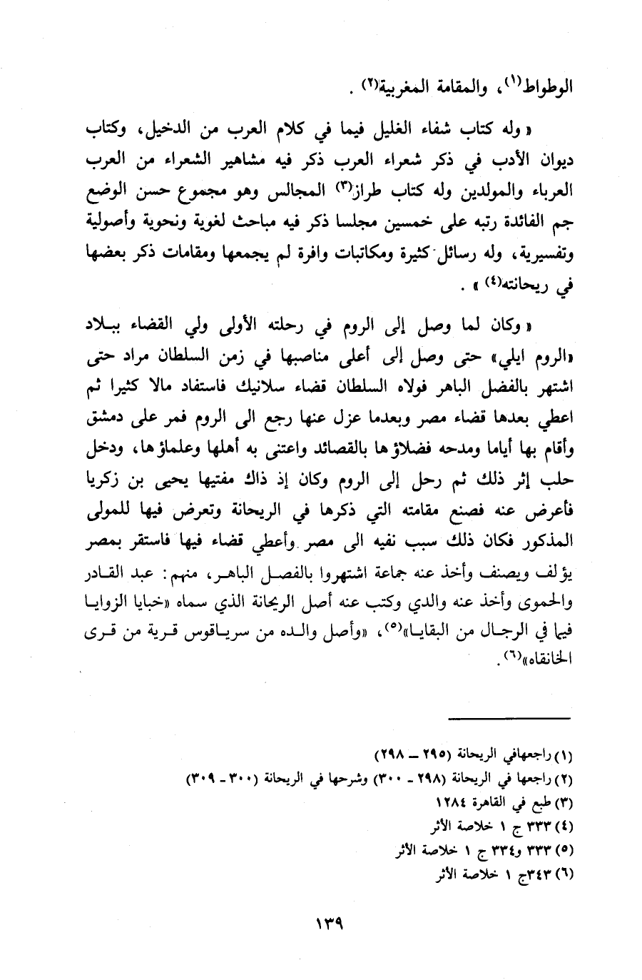 «و كان لما وصل إلى الروم في رحلته الأولى ولي القضاء ببلاد «الروم ايلي» حتى وصل إلى أعلى مناصبها في زمن السلطان مراد حتى اشتهر بالفضل الباهر فولاه السلطان قضاء سلانيك فاستفاد مالا كثيرا ثم اعطي بعدها قضاء مصر وبعد ما عزل عنها رجع الى الروم فمر على دمشق وأقام بها أياما ومدحه فضلاؤها بالقصائد واعتنى به أهلها وعلماؤها، ودخل حلب إثر ذلك ثم رحل إلى الروم وكان إذ ذاك مفتيها يحيى بن زكريا فأعرض عنه فصنع مقامته التي ذكرها في الريحانة وتعرض فيها للمولى المذكور فكان ذلك سبب نفيه الى مصر وأعطي قضاء فيها فاستقر بمصر يؤلف ويصنف وأخذ عنه جماعة اشتهروا بالفصل الباهر، منهم: عبد القادر والحموى وأخذ عنه والدي وكتب عنه أصل الريحانة الذي سماه «خبايا الزوايا فيما في الرجال من البقايا» 5، «و أصل والده من سرياقوس قرية من قرى الخانقاه» 6.