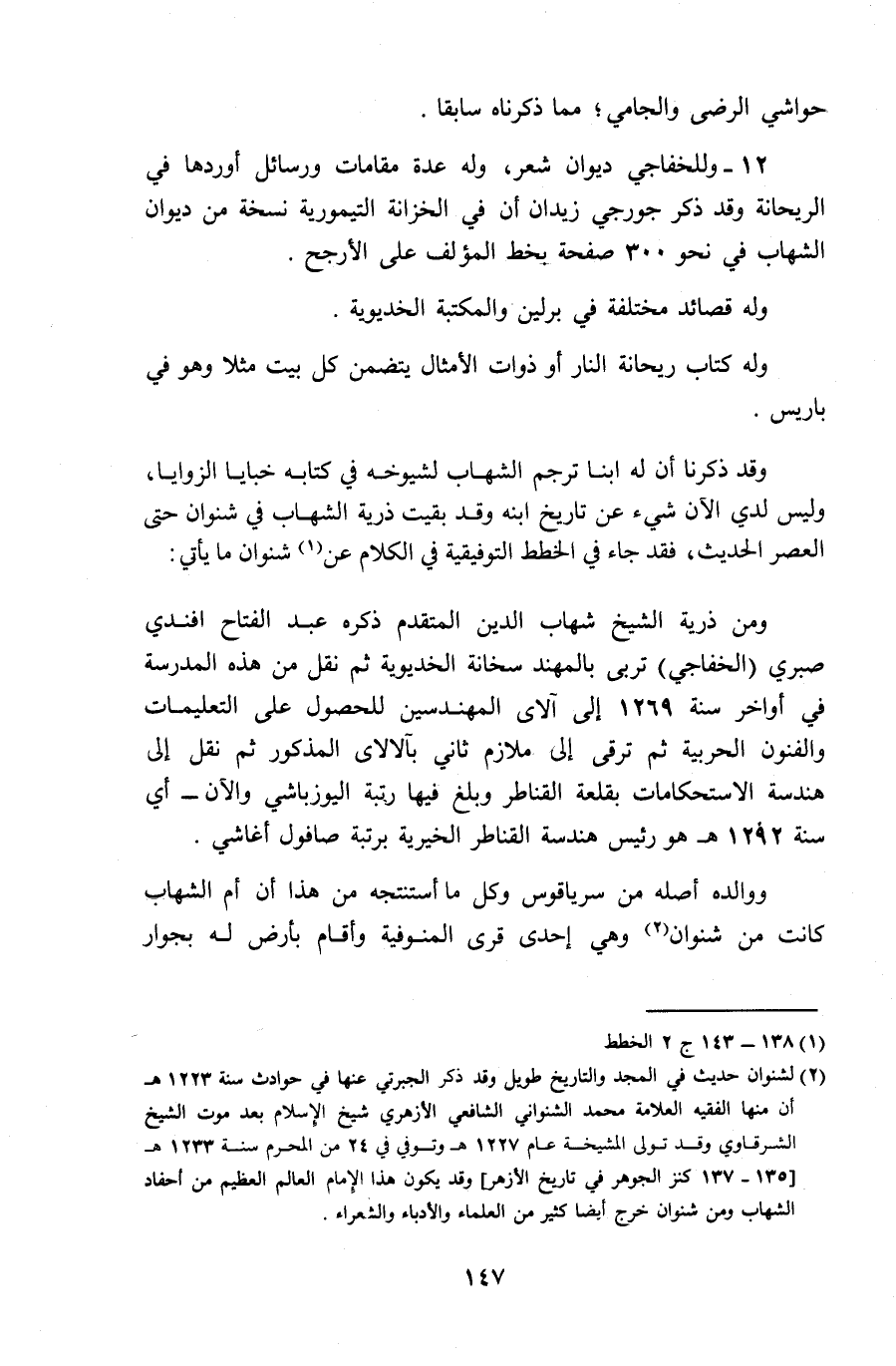 2) لشنوان حديث في المجد والتاريخ طويل وقد ذكر الجبرتي عنها في حوادث سنة 1223 ه أن منها الفقيه العلامة محمد الشنواني الشافعي الأزهري شيخ الإسلام بعد موت الشيخ الشرقاوي وقد تولى المشيخة عام 1227 ه وتوفي في 24 من المحرم سنة 1233 ه [135 - 137 كنز الجوهر في تاريخ الأزهر] وقد يكون هذا الإمام العالم العظيم من أحفاد الشهاب ومن شنوان خرج أيضا كثير من العلماء والأدباء والشعراء.