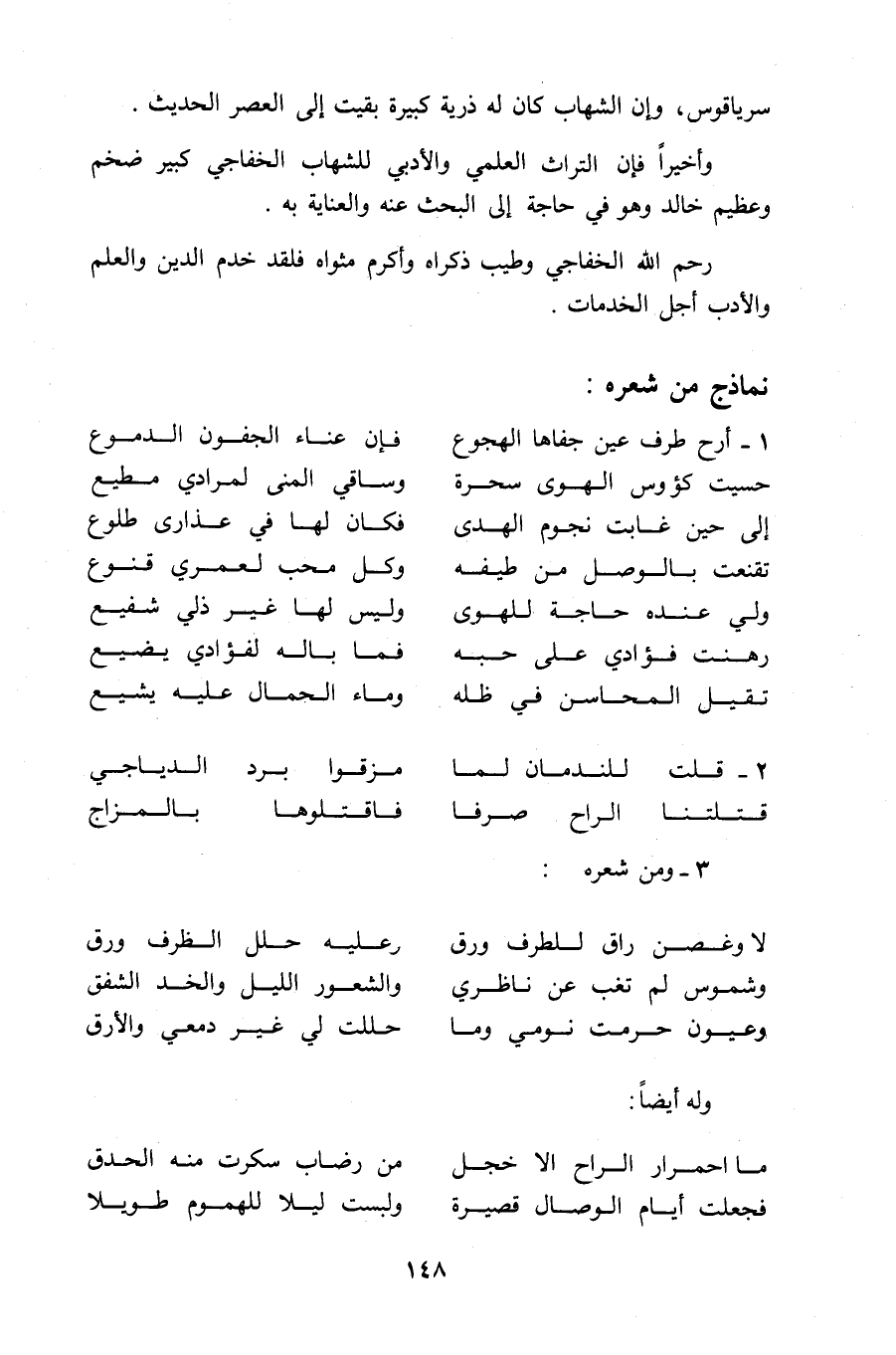 رحم اللّه الخفاجي وطيب ذكراه وأكرم مثواه فلقد خدم الدين والعلم والأدب أجل الخدمات.