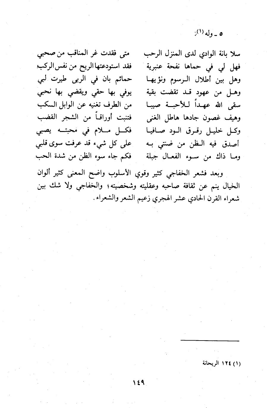 وبعد فشعر الخفاجي كثير وقوي الأسلوب واضح المعنى كثير ألوان الخيال ينم عن ثقافة صاحبه وعقليته وشخصيته؛ والخفاجي ولا شك بين شعراء القرن الحادي عشر الهجري زعيم الشعر والشعراء.