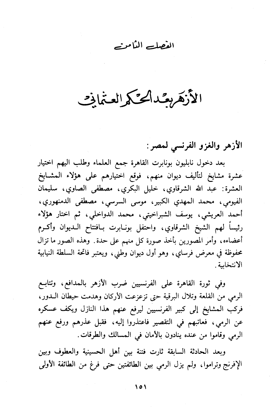 بعد دخول نابليون بونابرت القاهرة جمع العلماء وطلب اليهم اختيار عشرة مشايخ لتأليف ديوان منهم، فوقع اختيارهم على هؤلاء المشايخ العشرة: عبد اللّه الشرقاوي، خليل البكري، مصطفى الصاوي، سليمان الفيومي، محمد المهدي الكبير، موسى السرسي، مصطفى الدمنهوري، أحمد العريشي، يوسف الشبراخيتي، محمد الدواخلي، ثم اختار هؤلاء رئيسا لهم الشيخ الشرقاوي، واحتفل بونابرت بافتتاح الديوان وأكرم أعضاءه، وأمر المصورين بأخذ صورة كل منهم على حدة. وهذه الصور ما تزال محفوظة في معرض فرساي، وهو أول ديوان وطني، ويعتبر فاتحة السلطة النيابية الانتخابية.