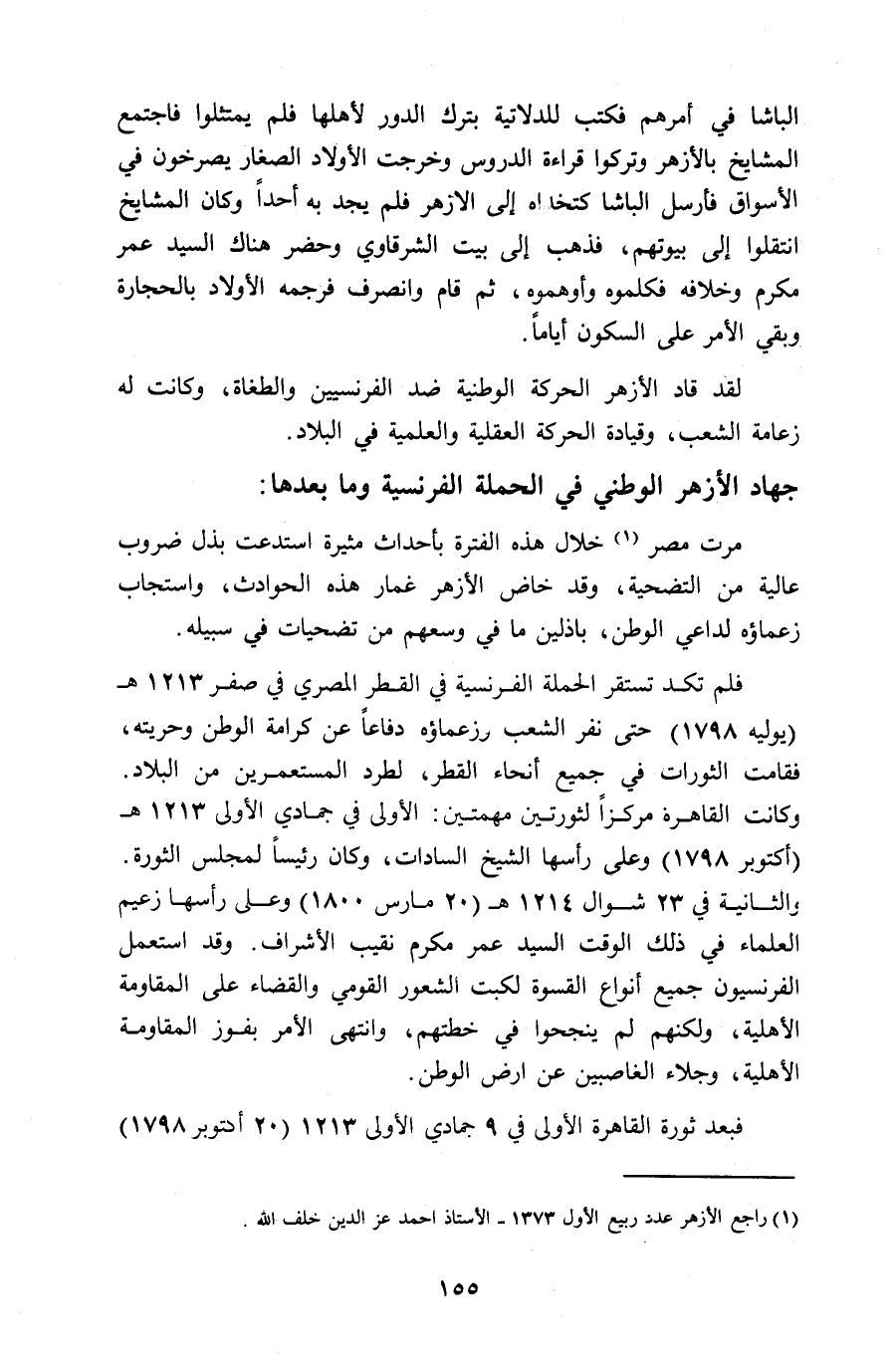 لقد قاد الأزهر الحركة الوطنية ضد الفرنسيين والطغاة، وكانت له زعامة الشعب، وقيادة الحركة العقلية والعلمية في البلاد.