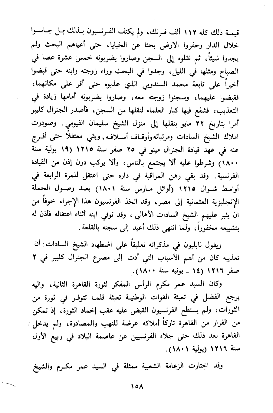ويقول نابليون في مذكراته تعليقا على اضطهاد الشيخ السادات: أن تعذيبه كان من أهم الأسباب التي أدت إلى مصرع الجنرال كليبر في 2 صفر 1216 (14 - يونيه سنة 1800).
